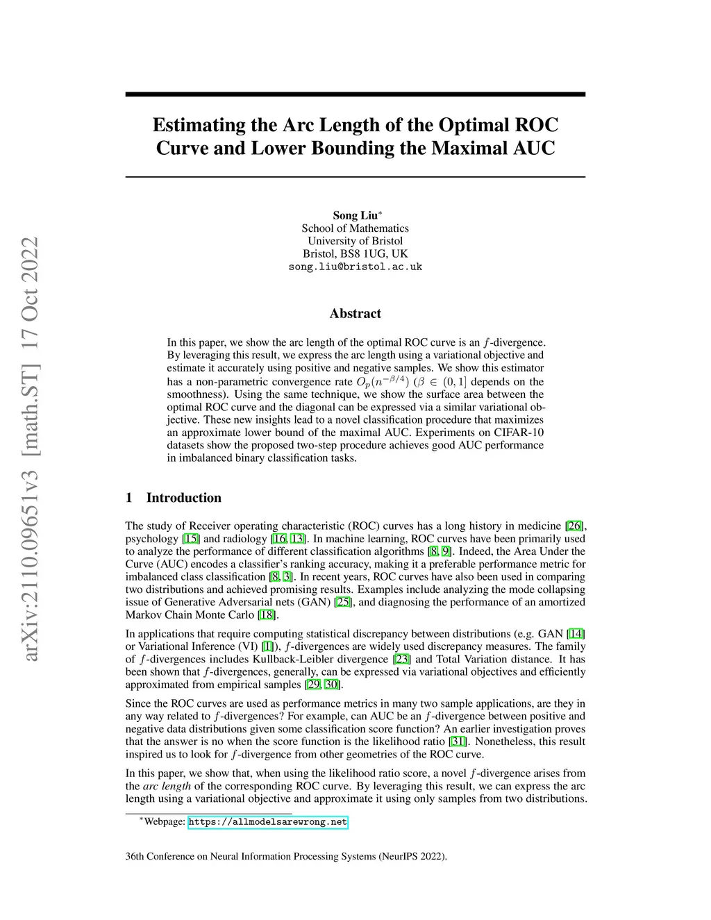 In this paper, we show the arc length of the optimal ROC curve is an -divergence. By leveraging this result, we express the arc length using a variational objective and estimate it accurately using positive and negative samples. We show this estimator has a non-parametric convergence rate ( depends on the smoothness). Using the same technique, we show the surface area between the optimal ROC curve and the diagonal can be expressed via a similar variational objective. These new insights lead to a novel classification procedure that maximizes an approximate lower bound of the maximal AUC. Experiments on CIFAR-10 datasets show the proposed two-step procedure achieves good AUC performance in imbalanced binary classification tasks.