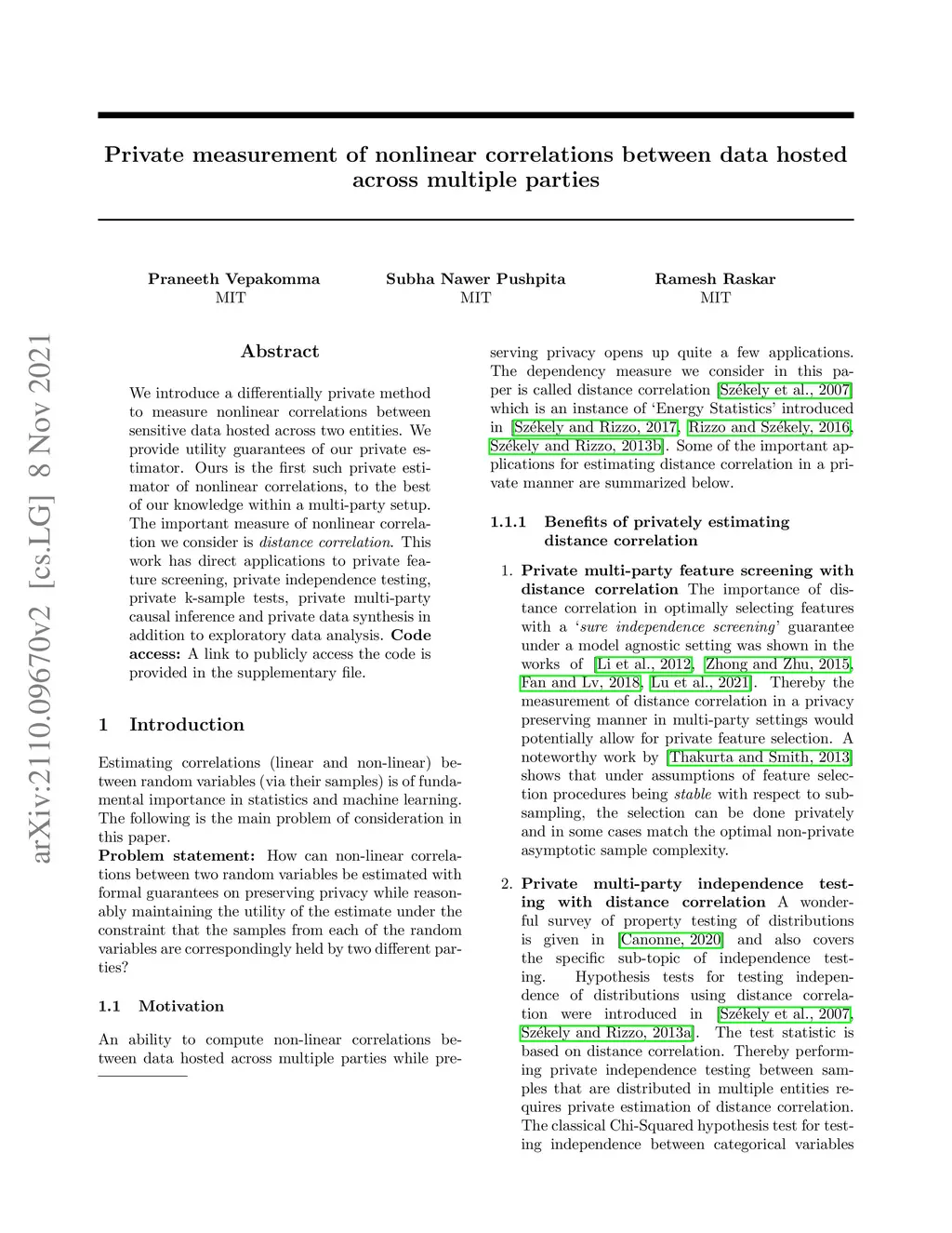 We introduce a differentially private method to measure nonlinear correlations between sensitive data hosted across two entities. We provide utility guarantees of our private estimator. Ours is the first such private estimator of nonlinear correlations, to the best of our knowledge within a multi-party setup. The important measure of nonlinear correlation we consider is distance correlation. This work has direct applications to private feature screening, private independence testing, private k-sample tests, private multi-party causal inference and private data synthesis in addition to exploratory data analysis. Code access: A link to publicly access the code is provided in the supplementary file.
