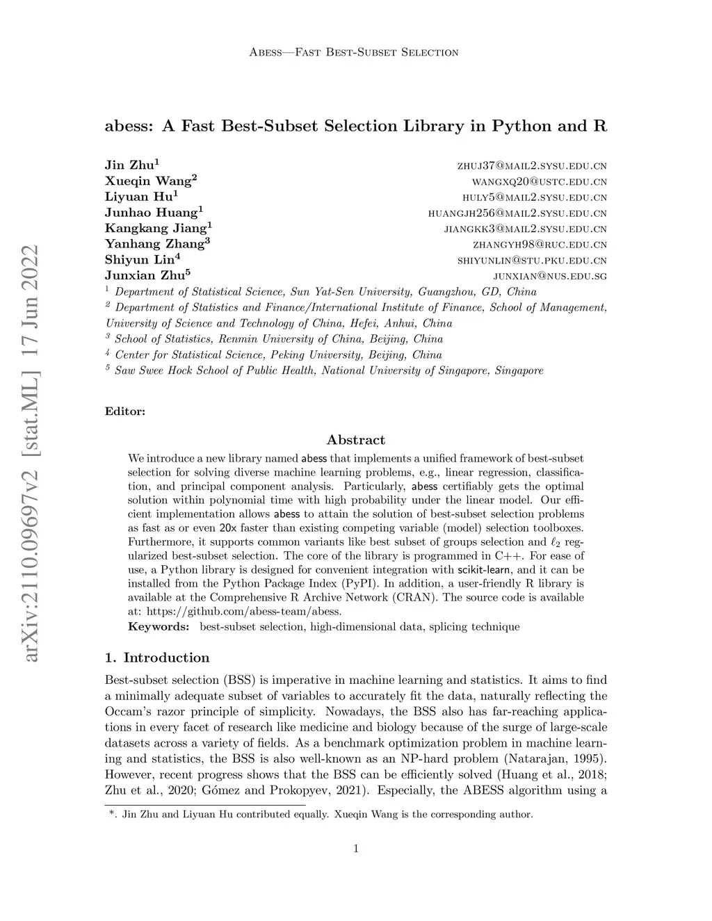We introduce a new library named abess that implements a unified framework of best-subset selection for solving diverse machine learning problems, e.g., linear regression, classification, and principal component analysis. Particularly, the abess certifiably gets the optimal solution within polynomial times with high probability under the linear model. Our efficient implementation allows abess to attain the solution of best-subset selection problems as fast as or even 20x faster than existing competing variable (model) selection toolboxes. Furthermore, it supports common variants like best group subset selection and regularized best-subset selection. The core of the library is programmed in C++. For ease of use, a Python library is designed for conveniently integrating with scikit-learn, and it can be installed from the Python library Index. In addition, a user-friendly R library is available at the Comprehensive R Archive Network. The source code is available at: https://github.com/abess-team/abess.