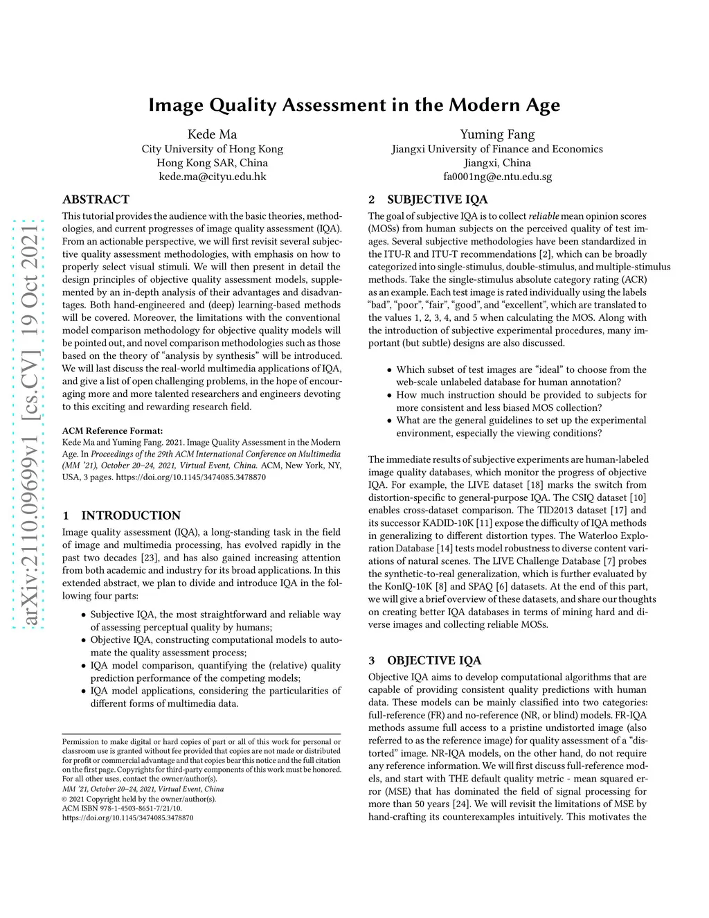 This tutorial provides the audience with the basic theories, methodologies, and current progresses of image quality assessment (IQA). From an actionable perspective, we will first revisit several subjective quality assessment methodologies, with emphasis on how to properly select visual stimuli. We will then present in detail the design principles of objective quality assessment models, supplemented by an in-depth analysis of their advantages and disadvantages. Both hand-engineered and (deep) learning-based methods will be covered. Moreover, the limitations with the conventional model comparison methodology for objective quality models will be pointed out, and novel comparison methodologies such as those based on the theory of "analysis by synthesis" will be introduced. We will last discuss the real-world multimedia applications of IQA, and give a list of open challenging problems, in the hope of encouraging more and more talented researchers and engineers devoting to this exciting and rewarding research field.