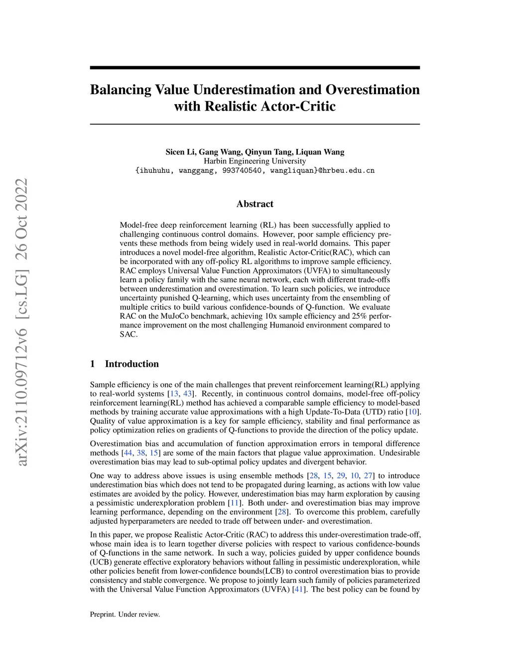 Model-free deep reinforcement learning (RL) has been successfully applied to challenging continuous control domains. However, poor sample efficiency prevents these methods from being widely used in real-world domains. This paper introduces a novel model-free algorithm, Realistic Actor-Critic(RAC), which can be incorporated with any off-policy RL algorithms to improve sample efficiency. RAC employs Universal Value Function Approximators (UVFA) to simultaneously learn a policy family with the same neural network, each with different trade-offs between underestimation and overestimation. To learn such policies, we introduce uncertainty punished Q-learning, which uses uncertainty from the ensembling of multiple critics to build various confidence-bounds of Q-function. We evaluate RAC on the MuJoCo benchmark, achieving 10x sample efficiency and 25\% performance improvement on the most challenging Humanoid environment compared to SAC.