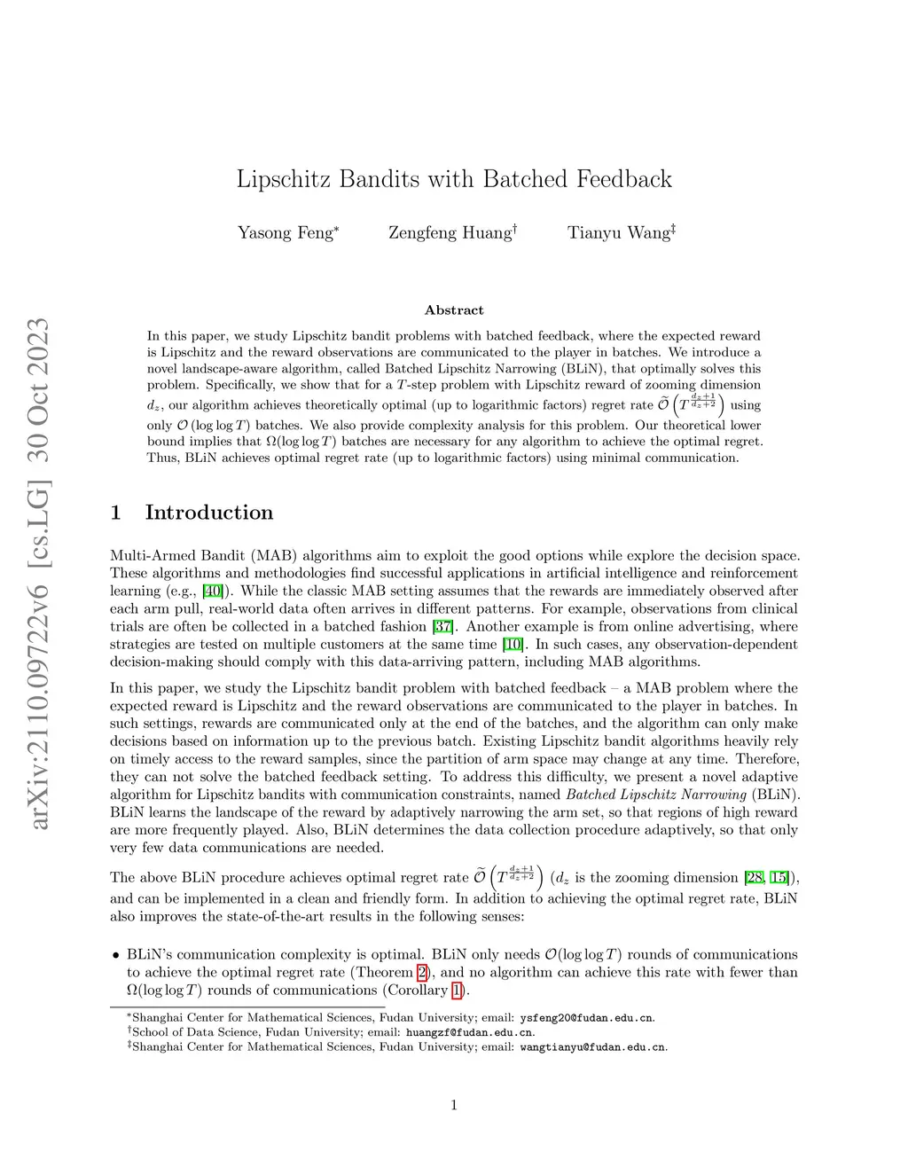In this paper, we study Lipschitz bandit problems with batched feedback, where the expected reward is Lipschitz and the reward observations are communicated to the player in batches. We introduce a novel landscape-aware algorithm, called Batched Lipschitz Narrowing (BLiN), that optimally solves this problem. Specifically, we show that for a -step problem with Lipschitz reward of zooming dimension , our algorithm achieves theoretically optimal (up to logarithmic factors) regret rate using only $ \mathcal{O} \left( \log\log T\right) $ batches. We also provide complexity analysis for this problem. Our theoretical lower bound implies that batches are necessary for any algorithm to achieve the optimal regret. Thus, BLiN achieves optimal regret rate (up to logarithmic factors) using minimal communication.