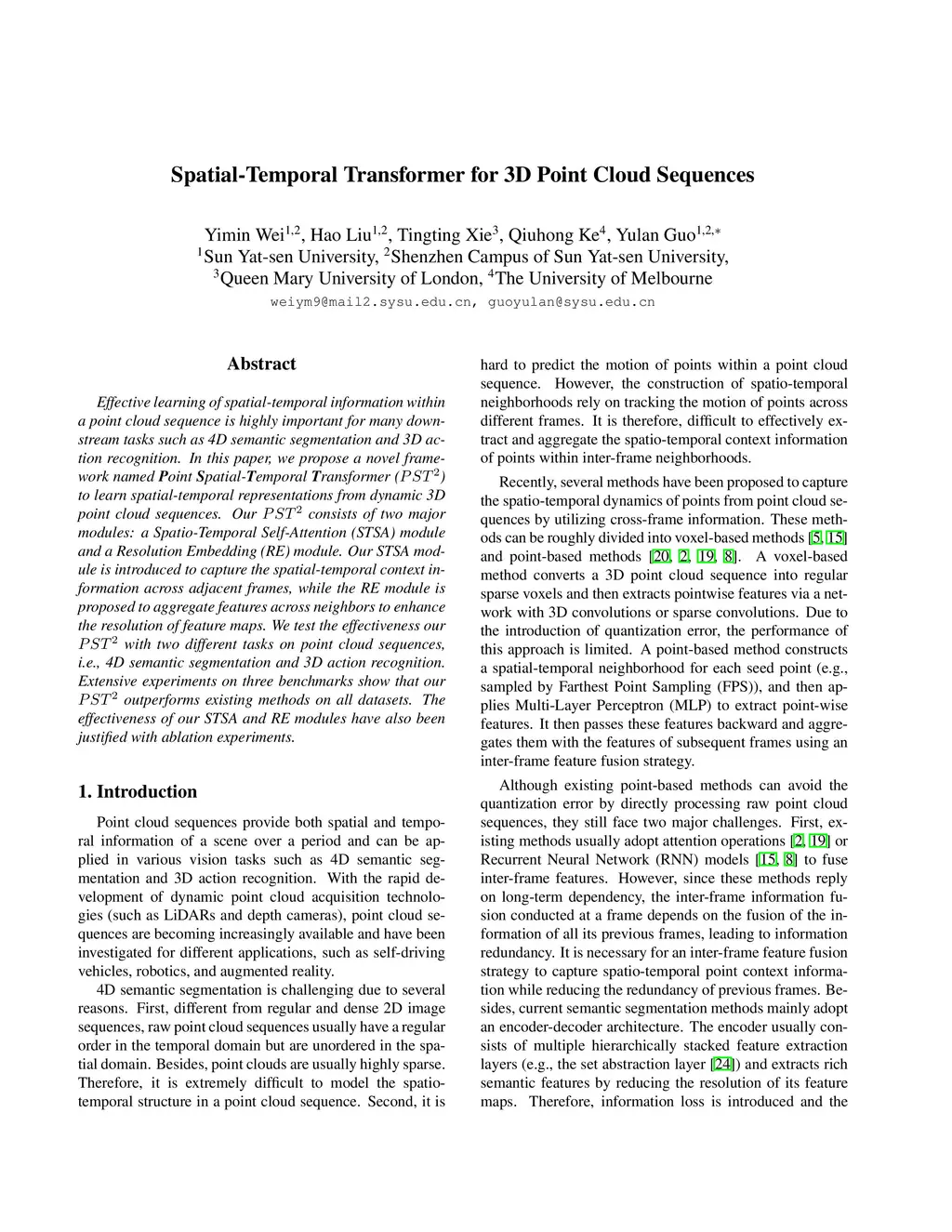 Effective learning of spatial-temporal information within a point cloud sequence is highly important for many down-stream tasks such as 4D semantic segmentation and 3D action recognition. In this paper, we propose a novel framework named Point Spatial-Temporal Transformer (PST2) to learn spatial-temporal representations from dynamic 3D point cloud sequences. Our PST2 consists of two major modules: a Spatio-Temporal Self-Attention (STSA) module and a Resolution Embedding (RE) module. Our STSA module is introduced to capture the spatial-temporal context information across adjacent frames, while the RE module is proposed to aggregate features across neighbors to enhance the resolution of feature maps. We test the effectiveness our PST2 with two different tasks on point cloud sequences, i.e., 4D semantic segmentation and 3D action recognition. Extensive experiments on three benchmarks show that our PST2 outperforms existing methods on all datasets. The effectiveness of our STSA and RE modules have also been justified with ablation experiments.