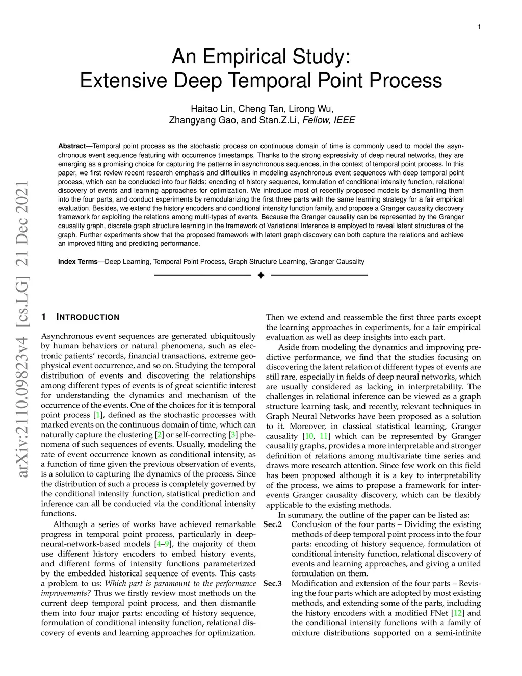 Temporal point process as the stochastic process on continuous domain of time is commonly used to model the asynchronous event sequence featuring with occurrence timestamps. Thanks to the strong expressivity of deep neural networks, they are emerging as a promising choice for capturing the patterns in asynchronous sequences, in the context of temporal point process. In this paper, we first review recent research emphasis and difficulties in modeling asynchronous event sequences with deep temporal point process, which can be concluded into four fields: encoding of history sequence, formulation of conditional intensity function, relational discovery of events and learning approaches for optimization. We introduce most of recently proposed models by dismantling them into the four parts, and conduct experiments by remodularizing the first three parts with the same learning strategy for a fair empirical evaluation. Besides, we extend the history encoders and conditional intensity function family, and propose a Granger causality discovery framework for exploiting the relations among multi-types of events. Because the Granger causality can be represented by the Granger causality graph, discrete graph structure learning in the framework of Variational Inference is employed to reveal latent structures of the graph. Further experiments show that the proposed framework with latent graph discovery can both capture the relations and achieve an improved fitting and predicting performance.