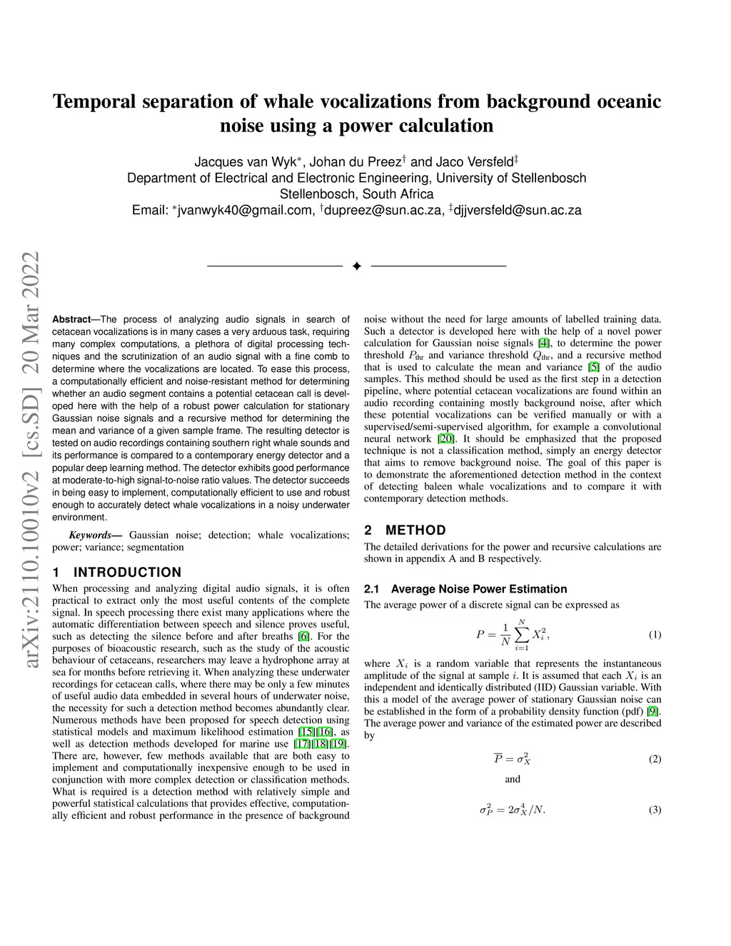 The process of analyzing audio signals in search of cetacean vocalizations is in many cases a very arduous task, requiring many complex computations, a plethora of digital processing techniques and the scrutinization of an audio signal with a fine comb to determine where the vocalizations are located. To ease this process, a computationally efficient and noise-resistant method for determining whether an audio segment contains a potential cetacean call is developed here with the help of a robust power calculation for stationary Gaussian noise signals and a recursive method for determining the mean and variance of a given sample frame. The resulting detector is tested on audio recordings containing southern right whale sounds and its performance is compared to a contemporary energy detector and a popular deep learning method. The detector exhibits good performance at moderate-to-high signal-to-noise ratio values. The detector succeeds in being easy to implement, computationally efficient to use and robust enough to accurately detect whale vocalizations in a noisy underwater environment.