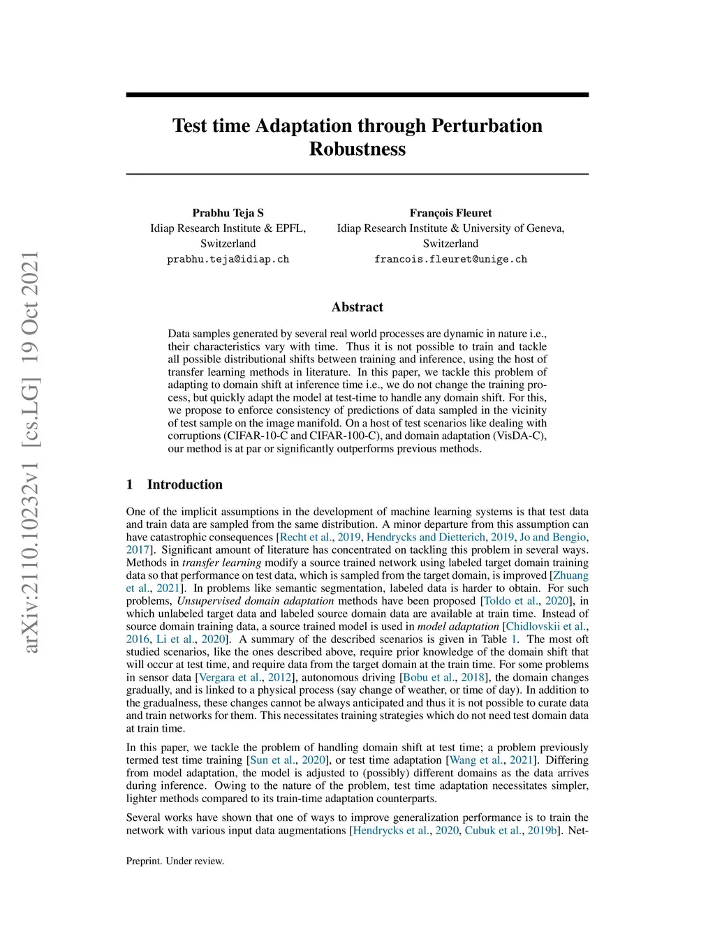 Data samples generated by several real world processes are dynamic in nature \textit{i.e.}, their characteristics vary with time. Thus it is not possible to train and tackle all possible distributional shifts between training and inference, using the host of transfer learning methods in literature. In this paper, we tackle this problem of adapting to domain shift at inference time \textit{i.e.}, we do not change the training process, but quickly adapt the model at test-time to handle any domain shift. For this, we propose to enforce consistency of predictions of data sampled in the vicinity of test sample on the image manifold. On a host of test scenarios like dealing with corruptions (CIFAR-10-C and CIFAR-100-C), and domain adaptation (VisDA-C), our method is at par or significantly outperforms previous methods.
