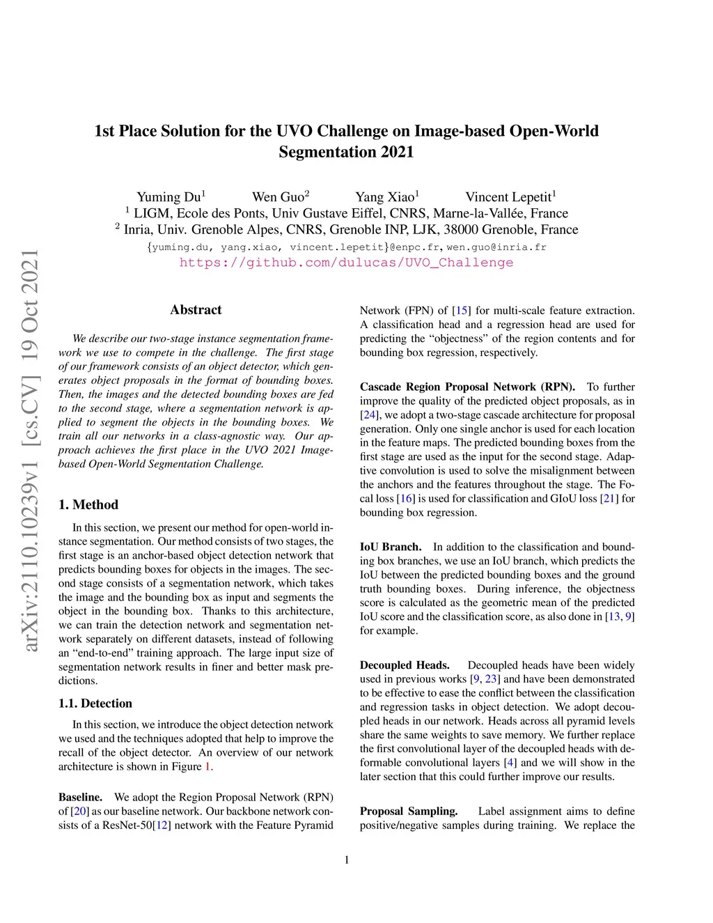 We describe our two-stage instance segmentation framework we use to compete in the challenge. The first stage of our framework consists of an object detector, which generates object proposals in the format of bounding boxes. Then, the images and the detected bounding boxes are fed to the second stage, where a segmentation network is applied to segment the objects in the bounding boxes. We train all our networks in a class-agnostic way. Our approach achieves the first place in the UVO 2021 Image-based Open-World Segmentation Challenge.