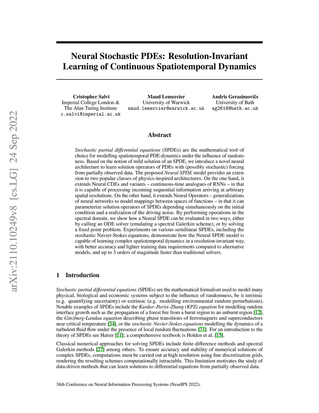 Stochastic partial differential equations (SPDEs) are the mathematical tool of choice for modelling spatiotemporal PDE-dynamics under the influence of randomness. Based on the notion of mild solution of an SPDE, we introduce a novel neural architecture to learn solution operators of PDEs with (possibly stochastic) forcing from partially observed data. The proposed Neural SPDE model provides an extension to two popular classes of physics-inspired architectures. On the one hand, it extends Neural CDEs and variants -- continuous-time analogues of RNNs -- in that it is capable of processing incoming sequential information arriving at arbitrary spatial resolutions. On the other hand, it extends Neural Operators -- generalizations of neural networks to model mappings between spaces of functions -- in that it can parameterize solution operators of SPDEs depending simultaneously on the initial condition and a realization of the driving noise. By performing operations in the spectral domain, we show how a Neural SPDE can be evaluated in two ways, either by calling an ODE solver (emulating a spectral Galerkin scheme), or by solving a fixed point problem. Experiments on various semilinear SPDEs, including the stochastic Navier-Stokes equations, demonstrate how the Neural SPDE model is capable of learning complex spatiotemporal dynamics in a resolution-invariant way, with better accuracy and lighter training data requirements compared to alternative models, and up to 3 orders of magnitude faster than traditional solvers.