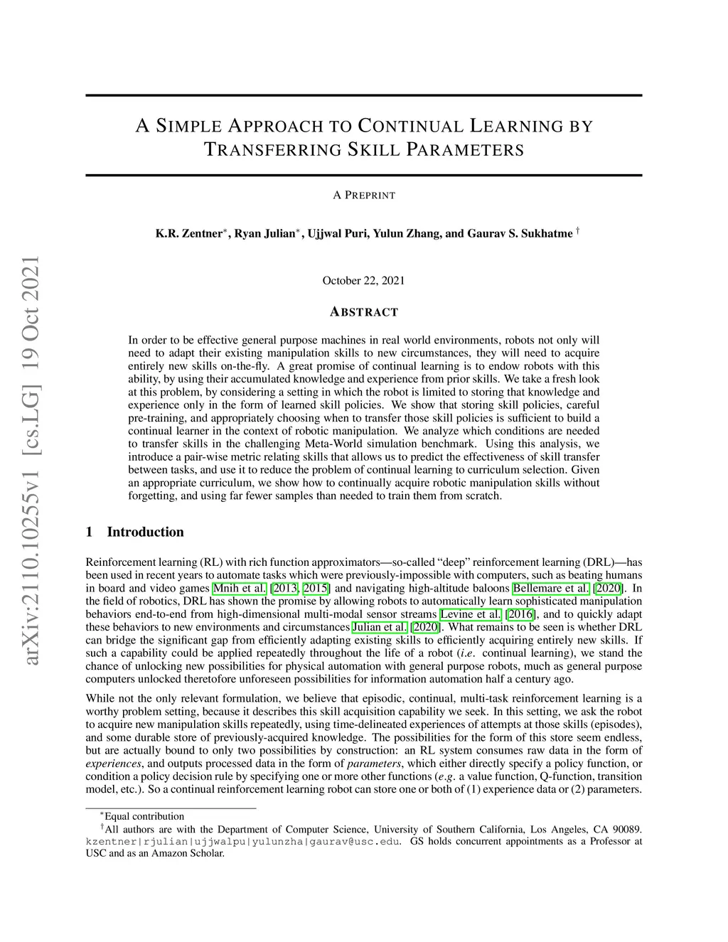 A Simple Approach to Continual Learning by Transferring Skill Parameters
