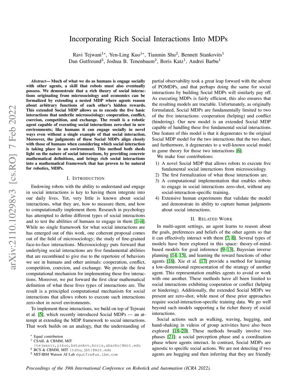 Much of what we do as humans is engage socially with other agents, a skill that robots must also eventually possess. We demonstrate that a rich theory of social interactions originating from microsociology and economics can be formalized by extending a nested MDP where agents reason about arbitrary functions of each other's hidden rewards. This extended Social MDP allows us to encode the five basic interactions that underlie microsociology: cooperation, conflict, coercion, competition, and exchange. The result is a robotic agent capable of executing social interactions zero-shot in new environments; like humans it can engage socially in novel ways even without a single example of that social interaction. Moreover, the judgments of these Social MDPs align closely with those of humans when considering which social interaction is taking place in an environment. This method both sheds light on the nature of social interactions, by providing concrete mathematical definitions, and brings rich social interactions into a mathematical framework that has proven to be natural for robotics, MDPs.