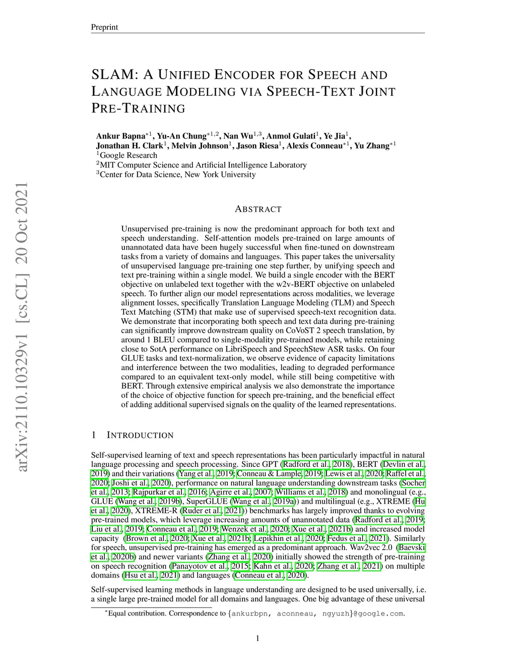 Unsupervised pre-training is now the predominant approach for both text and speech understanding. Self-attention models pre-trained on large amounts of unannotated data have been hugely successful when fine-tuned on downstream tasks from a variety of domains and languages. This paper takes the universality of unsupervised language pre-training one step further, by unifying speech and text pre-training within a single model. We build a single encoder with the BERT objective on unlabeled text together with the w2v-BERT objective on unlabeled speech. To further align our model representations across modalities, we leverage alignment losses, specifically Translation Language Modeling (TLM) and Speech Text Matching (STM) that make use of supervised speech-text recognition data. We demonstrate that incorporating both speech and text data during pre-training can significantly improve downstream quality on CoVoST~2 speech translation, by around 1 BLEU compared to single-modality pre-trained models, while retaining close to SotA performance on LibriSpeech and SpeechStew ASR tasks. On four GLUE tasks and text-normalization, we observe evidence of capacity limitations and interference between the two modalities, leading to degraded performance compared to an equivalent text-only model, while still being competitive with BERT. Through extensive empirical analysis we also demonstrate the importance of the choice of objective function for speech pre-training, and the beneficial effect of adding additional supervised signals on the quality of the learned representations.