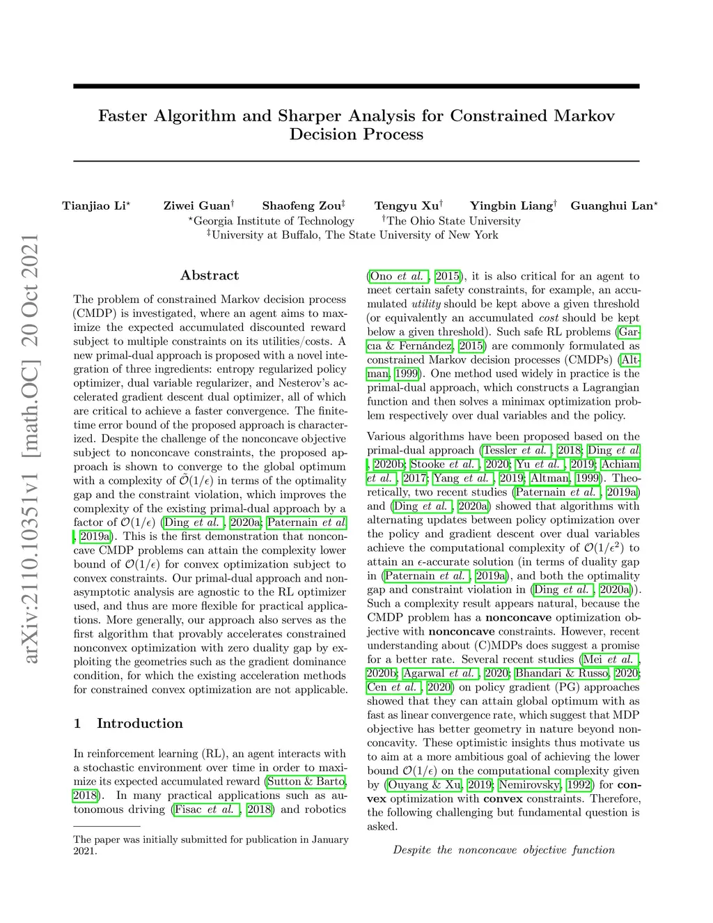 The problem of constrained Markov decision process (CMDP) is investigated, where an agent aims to maximize the expected accumulated discounted reward subject to multiple constraints on its utilities/costs. A new primal-dual approach is proposed with a novel integration of three ingredients: entropy regularized policy optimizer, dual variable regularizer, and Nesterov's accelerated gradient descent dual optimizer, all of which are critical to achieve a faster convergence. The finite-time error bound of the proposed approach is characterized. Despite the challenge of the nonconcave objective subject to nonconcave constraints, the proposed approach is shown to converge to the global optimum with a complexity of in terms of the optimality gap and the constraint violation, which improves the complexity of the existing primal-dual approach by a factor of \citep{ding2020natural,paternain2019constrained}. This is the first demonstration that nonconcave CMDP problems can attain the complexity lower bound of for convex optimization subject to convex constraints. Our primal-dual approach and non-asymptotic analysis are agnostic to the RL optimizer used, and thus are more flexible for practical applications. More generally, our approach also serves as the first algorithm that provably accelerates constrained nonconvex optimization with zero duality gap by exploiting the geometries such as the gradient dominance condition, for which the existing acceleration methods for constrained convex optimization are not applicable.