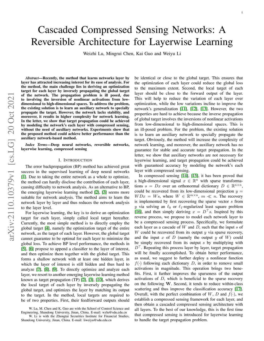 Recently, the method that learns networks layer by layer has attracted increasing interest for its ease of analysis. For the method, the main challenge lies in deriving an optimization target for each layer by inversely propagating the global target of the network. The propagation problem is ill posed, due to involving the inversion of nonlinear activations from lowdimensional to high-dimensional spaces. To address the problem, the existing solution is to learn an auxiliary network to specially propagate the target. However, the network lacks stability, and moreover, it results in higher complexity for network learning. In the letter, we show that target propagation could be achieved by modeling the network s each layer with compressed sensing, without the need of auxiliary networks. Experiments show that the proposed method could achieve better performance than the auxiliary network-based method.