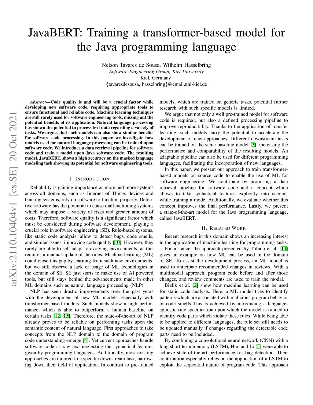 Code quality is and will be a crucial factor while developing new software code, requiring appropriate tools to ensure functional and reliable code. Machine learning techniques are still rarely used for software engineering tools, missing out the potential benefits of its application. Natural language processing has shown the potential to process text data regarding a variety of tasks. We argue, that such models can also show similar benefits for software code processing. In this paper, we investigate how models used for natural language processing can be trained upon software code. We introduce a data retrieval pipeline for software code and train a model upon Java software code. The resulting model, JavaBERT, shows a high accuracy on the masked language modeling task showing its potential for software engineering tools.