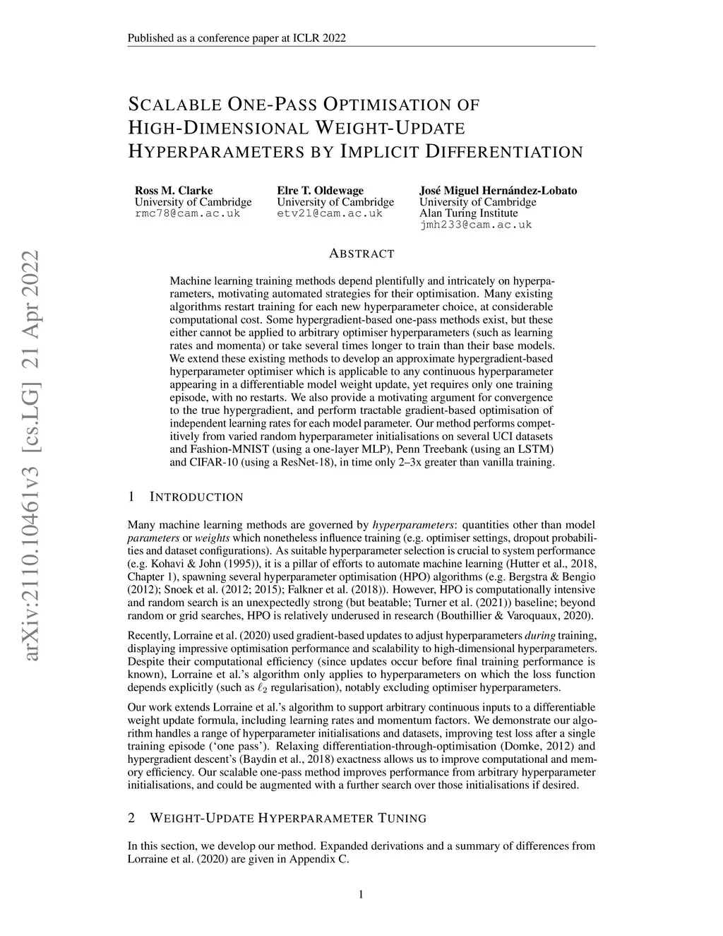 Machine learning training methods depend plentifully and intricately on hyperparameters, motivating automated strategies for their optimisation. Many existing algorithms restart training for each new hyperparameter choice, at considerable computational cost. Some hypergradient-based one-pass methods exist, but these either cannot be applied to arbitrary optimiser hyperparameters (such as learning rates and momenta) or take several times longer to train than their base models. We extend these existing methods to develop an approximate hypergradient-based hyperparameter optimiser which is applicable to any continuous hyperparameter appearing in a differentiable model weight update, yet requires only one training episode, with no restarts. We also provide a motivating argument for convergence to the true hypergradient, and perform tractable gradient-based optimisation of independent learning rates for each model parameter. Our method performs competitively from varied random hyperparameter initialisations on several UCI datasets and Fashion-MNIST (using a one-layer MLP), Penn Treebank (using an LSTM) and CIFAR-10 (using a ResNet-18), in time only 2-3x greater than vanilla training.