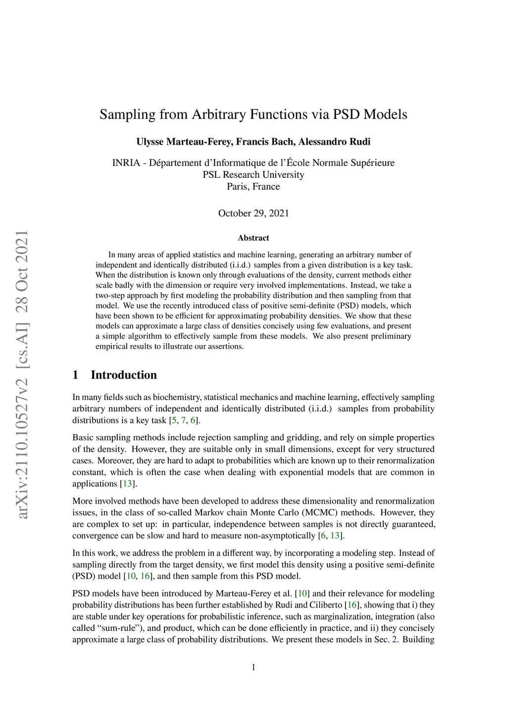 In many areas of applied statistics and machine learning, generating an arbitrary number of independent and identically distributed (i.i.d.) samples from a given distribution is a key task. When the distribution is known only through evaluations of the density, current methods either scale badly with the dimension or require very involved implementations. Instead, we take a two-step approach by first modeling the probability distribution and then sampling from that model. We use the recently introduced class of positive semi-definite (PSD) models, which have been shown to be efficient for approximating probability densities. We show that these models can approximate a large class of densities concisely using few evaluations, and present a simple algorithm to effectively sample from these models. We also present preliminary empirical results to illustrate our assertions.