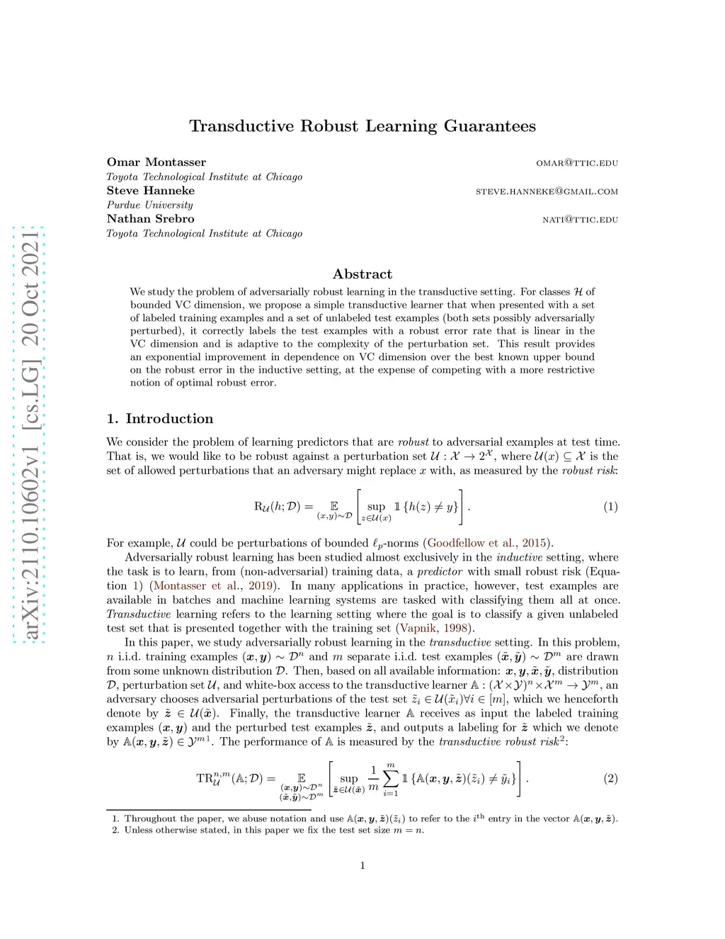 We study the problem of adversarially robust learning in the transductive setting. For classes of bounded VC dimension, we propose a simple transductive learner that when presented with a set of labeled training examples and a set of unlabeled test examples (both sets possibly adversarially perturbed), it correctly labels the test examples with a robust error rate that is linear in the VC dimension and is adaptive to the complexity of the perturbation set. This result provides an exponential improvement in dependence on VC dimension over the best known upper bound on the robust error in the inductive setting, at the expense of competing with a more restrictive notion of optimal robust error.