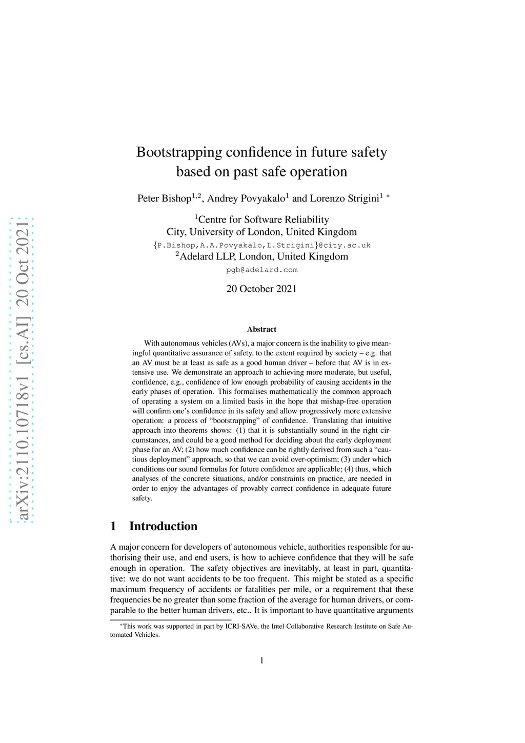 With autonomous vehicles (AVs), a major concern is the inability to give meaningful quantitative assurance of safety, to the extent required by society - e.g. that an AV must be at least as safe as a good human driver - before that AV is in extensive use. We demonstrate an approach to achieving more moderate, but useful, confidence, e.g., confidence of low enough probability of causing accidents in the early phases of operation. This formalises mathematically the common approach of operating a system on a limited basis in the hope that mishap-free operation will confirm one's confidence in its safety and allow progressively more extensive operation: a process of "bootstrapping" of confidence. Translating that intuitive approach into theorems shows: (1) that it is substantially sound in the right circumstances, and could be a good method for deciding about the early deployment phase for an AV; (2) how much confidence can be rightly derived from such a "cautious deployment" approach, so that we can avoid over-optimism; (3) under which conditions our sound formulas for future confidence are applicable; (4) thus, which analyses of the concrete situations, and/or constraints on practice, are needed in order to enjoy the advantages of provably correct confidence in adequate future safety.