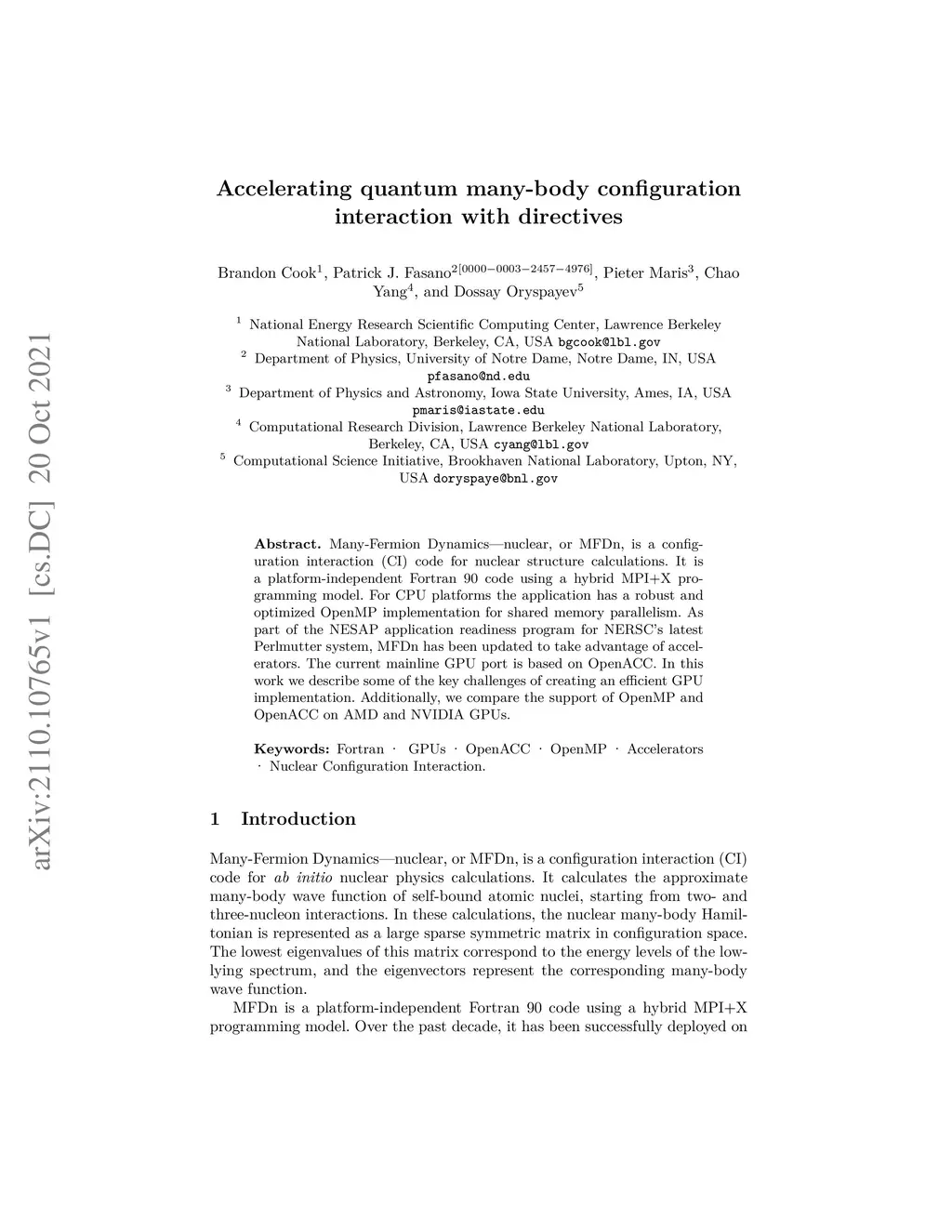 Many-Fermion Dynamics-nuclear, or MFDn, is a configuration interaction (CI) code for nuclear structure calculations. It is a platform-independent Fortran 90 code using a hybrid MPI+X programming model. For CPU platforms the application has a robust and optimized OpenMP implementation for shared memory parallelism. As part of the NESAP application readiness program for NERSC's latest Perlmutter system, MFDn has been updated to take advantage of accelerators. The current mainline GPU port is based on OpenACC. In this work we describe some of the key challenges of creating an efficient GPU implementation. Additionally, we compare the support of OpenMP and OpenACC on AMD and NVIDIA GPUs.