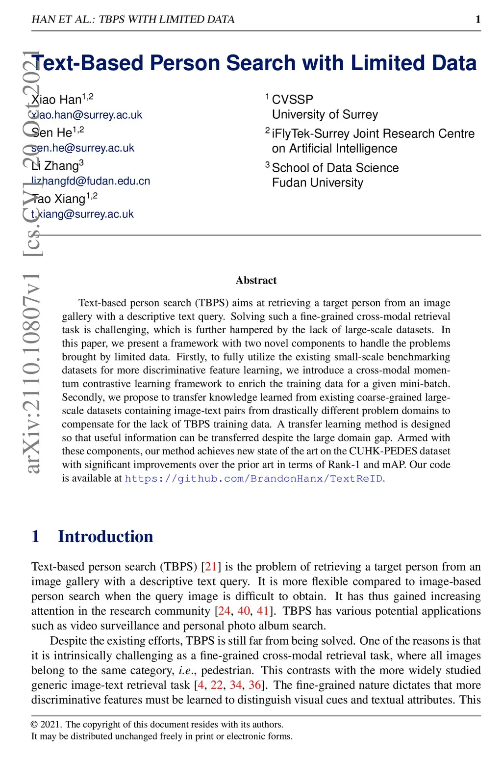 Text-based person search (TBPS) aims at retrieving a target person from an image gallery with a descriptive text query. Solving such a fine-grained cross-modal retrieval task is challenging, which is further hampered by the lack of large-scale datasets. In this paper, we present a framework with two novel components to handle the problems brought by limited data. Firstly, to fully utilize the existing small-scale benchmarking datasets for more discriminative feature learning, we introduce a cross-modal momentum contrastive learning framework to enrich the training data for a given mini-batch. Secondly, we propose to transfer knowledge learned from existing coarse-grained large-scale datasets containing image-text pairs from drastically different problem domains to compensate for the lack of TBPS training data. A transfer learning method is designed so that useful information can be transferred despite the large domain gap. Armed with these components, our method achieves new state of the art on the CUHK-PEDES dataset with significant improvements over the prior art in terms of Rank-1 and mAP. Our code is available at https://github.com/BrandonHanx/TextReID.
