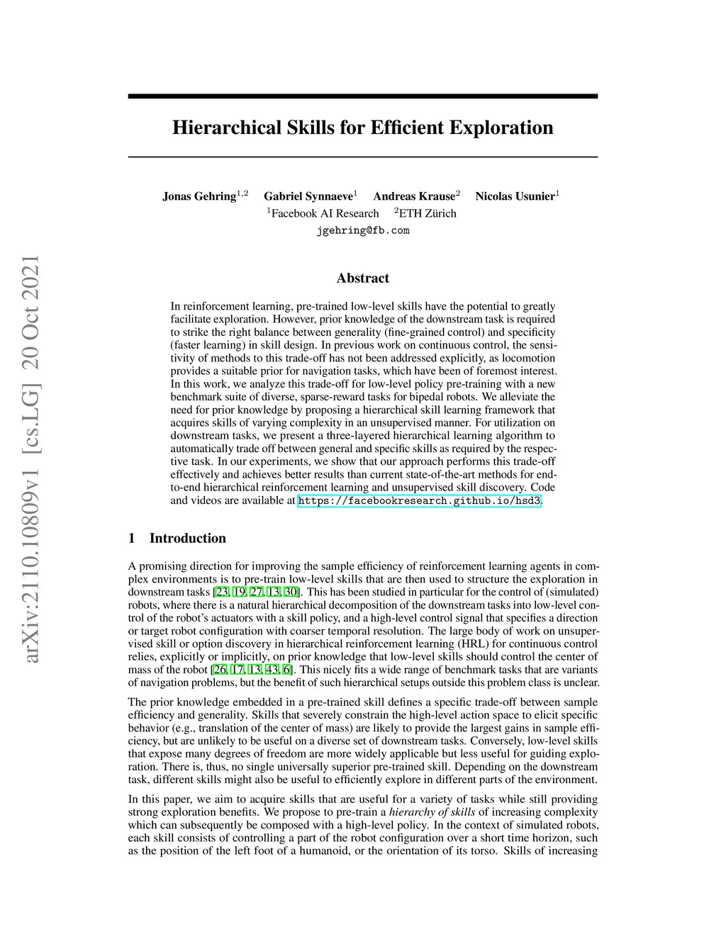 In reinforcement learning, pre-trained low-level skills have the potential to greatly facilitate exploration. However, prior knowledge of the downstream task is required to strike the right balance between generality (fine-grained control) and specificity (faster learning) in skill design. In previous work on continuous control, the sensitivity of methods to this trade-off has not been addressed explicitly, as locomotion provides a suitable prior for navigation tasks, which have been of foremost interest. In this work, we analyze this trade-off for low-level policy pre-training with a new benchmark suite of diverse, sparse-reward tasks for bipedal robots. We alleviate the need for prior knowledge by proposing a hierarchical skill learning framework that acquires skills of varying complexity in an unsupervised manner. For utilization on downstream tasks, we present a three-layered hierarchical learning algorithm to automatically trade off between general and specific skills as required by the respective task. In our experiments, we show that our approach performs this trade-off effectively and achieves better results than current state-of-the-art methods for end- to-end hierarchical reinforcement learning and unsupervised skill discovery. Code and videos are available at https://facebookresearch.github.io/hsd3 .
