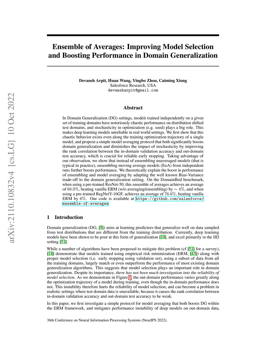 In Domain Generalization (DG) settings, models trained independently on a given set of training domains have notoriously chaotic performance on distribution shifted test domains, and stochasticity in optimization (e.g. seed) plays a big role. This makes deep learning models unreliable in real world settings. We first show that this chaotic behavior exists even along the training optimization trajectory of a single model, and propose a simple model averaging protocol that both significantly boosts domain generalization and diminishes the impact of stochasticity by improving the rank correlation between the in-domain validation accuracy and out-domain test accuracy, which is crucial for reliable early stopping. Taking advantage of our observation, we show that instead of ensembling unaveraged models (that is typical in practice), ensembling moving average models (EoA) from independent runs further boosts performance. We theoretically explain the boost in performance of ensembling and model averaging by adapting the well known Bias-Variance trade-off to the domain generalization setting. On the DomainBed benchmark, when using a pre-trained ResNet-50, this ensemble of averages achieves an average of , beating vanilla ERM (w/o averaging/ensembling) by , and when using a pre-trained RegNetY-16GF, achieves an average of , beating vanilla ERM by . Our code is available at https://github.com/salesforce/ensemble-of-averages.