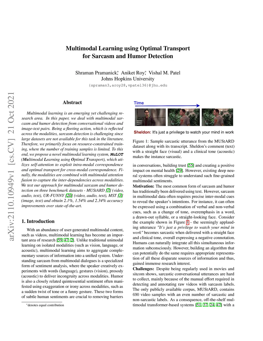 Multimodal learning is an emerging yet challenging research area. In this paper, we deal with multimodal sarcasm and humor detection from conversational videos and image-text pairs. Being a fleeting action, which is reflected across the modalities, sarcasm detection is challenging since large datasets are not available for this task in the literature. Therefore, we primarily focus on resource-constrained training, where the number of training samples is limited. To this end, we propose a novel multimodal learning system, MuLOT (Multimodal Learning using Optimal Transport), which utilizes self-attention to exploit intra-modal correspondence and optimal transport for cross-modal correspondence. Finally, the modalities are combined with multimodal attention fusion to capture the inter-dependencies across modalities. We test our approach for multimodal sarcasm and humor detection on three benchmark datasets - MUStARD (video, audio, text), UR-FUNNY (video, audio, text), MST (image, text) and obtain 2.1%, 1.54%, and 2.34% accuracy improvements over state-of-the-art.