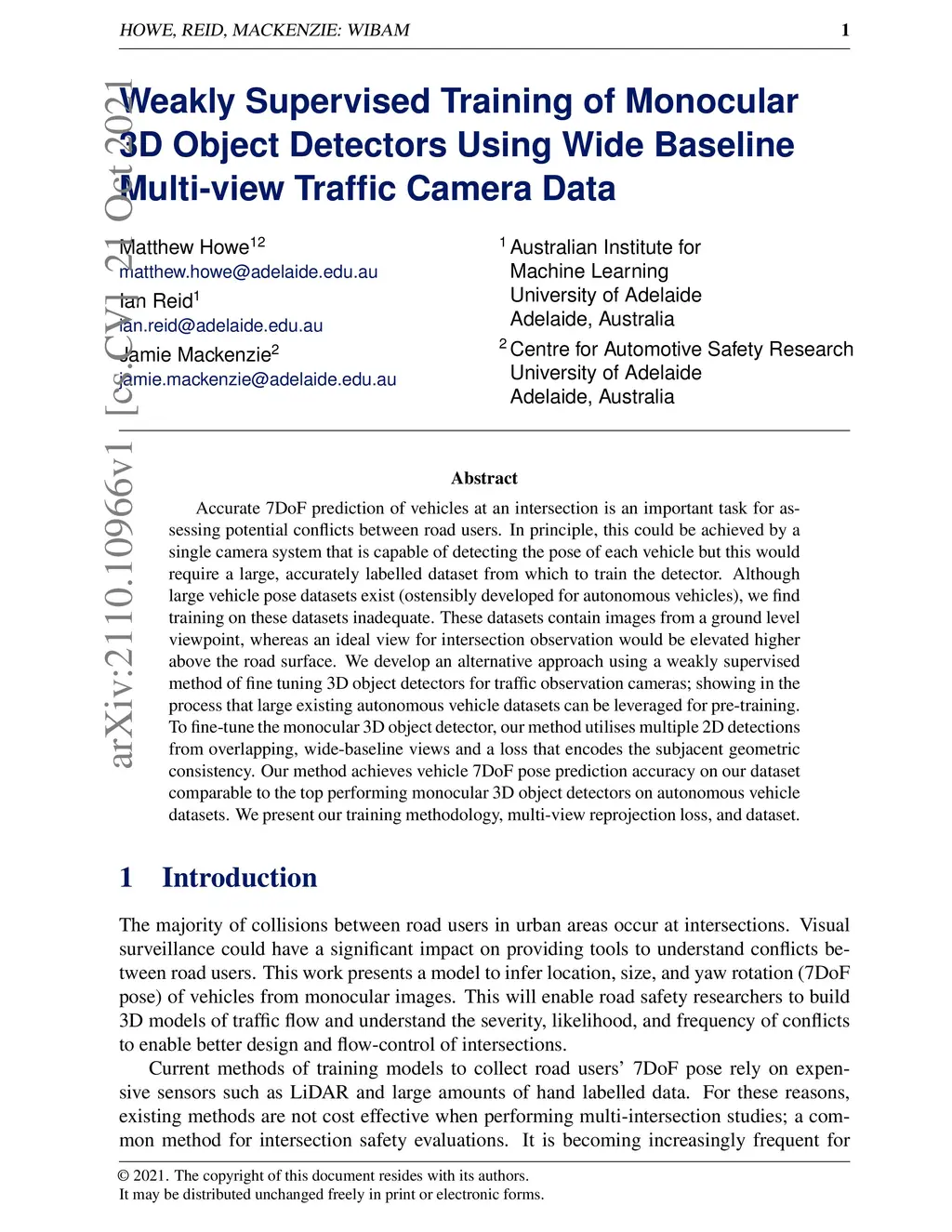 Accurate 7DoF prediction of vehicles at an intersection is an important task for assessing potential conflicts between road users. In principle, this could be achieved by a single camera system that is capable of detecting the pose of each vehicle but this would require a large, accurately labelled dataset from which to train the detector. Although large vehicle pose datasets exist (ostensibly developed for autonomous vehicles), we find training on these datasets inadequate. These datasets contain images from a ground level viewpoint, whereas an ideal view for intersection observation would be elevated higher above the road surface. We develop an alternative approach using a weakly supervised method of fine tuning 3D object detectors for traffic observation cameras; showing in the process that large existing autonomous vehicle datasets can be leveraged for pre-training. To fine-tune the monocular 3D object detector, our method utilises multiple 2D detections from overlapping, wide-baseline views and a loss that encodes the subjacent geometric consistency. Our method achieves vehicle 7DoF pose prediction accuracy on our dataset comparable to the top performing monocular 3D object detectors on autonomous vehicle datasets. We present our training methodology, multi-view reprojection loss, and dataset.