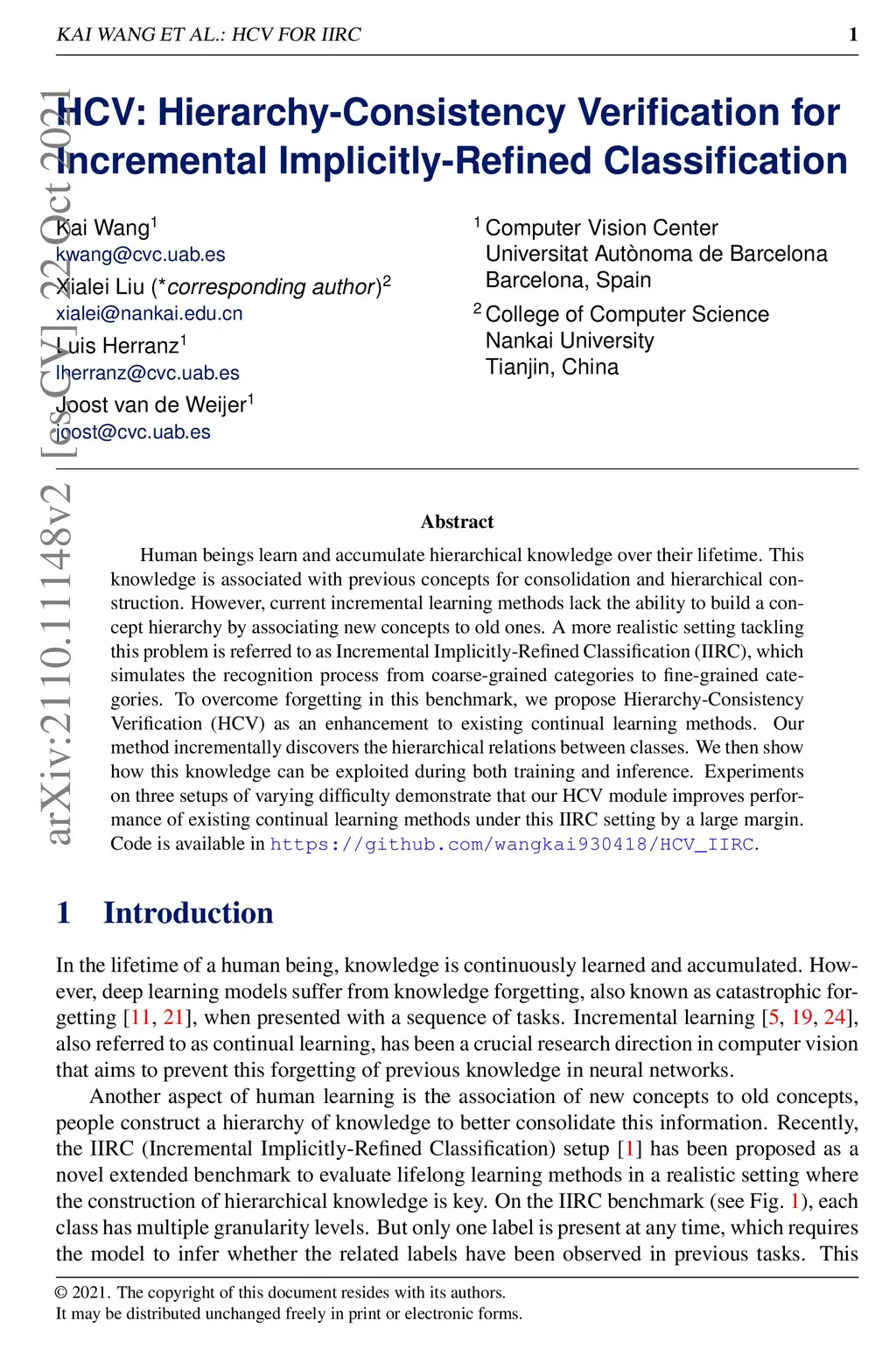 Human beings learn and accumulate hierarchical knowledge over their lifetime. This knowledge is associated with previous concepts for consolidation and hierarchical construction. However, current incremental learning methods lack the ability to build a concept hierarchy by associating new concepts to old ones. A more realistic setting tackling this problem is referred to as Incremental Implicitly-Refined Classification (IIRC), which simulates the recognition process from coarse-grained categories to fine-grained categories. To overcome forgetting in this benchmark, we propose Hierarchy-Consistency Verification (HCV) as an enhancement to existing continual learning methods. Our method incrementally discovers the hierarchical relations between classes. We then show how this knowledge can be exploited during both training and inference. Experiments on three setups of varying difficulty demonstrate that our HCV module improves performance of existing continual learning methods under this IIRC setting by a large margin. Code is available in https://github.com/wangkai930418/HCV_IIRC.