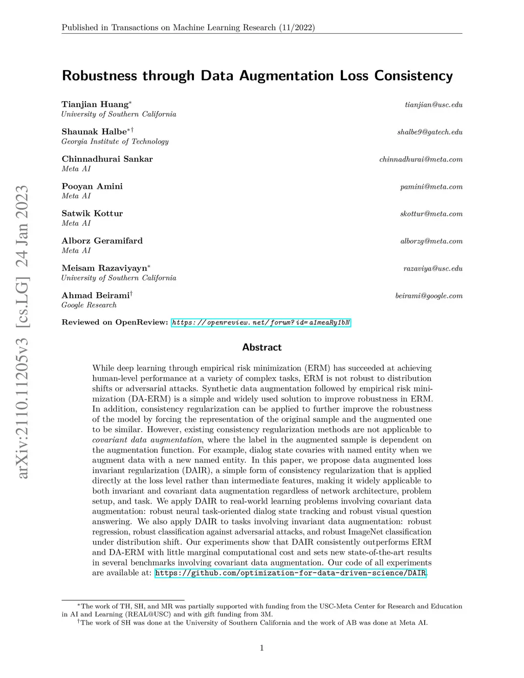 While deep learning through empirical risk minimization (ERM) has succeeded at achieving human-level performance at a variety of complex tasks, ERM is not robust to distribution shifts or adversarial attacks. Synthetic data augmentation followed by empirical risk minimization (DA-ERM) is a simple and widely used solution to improve robustness in ERM. In addition, consistency regularization can be applied to further improve the robustness of the model by forcing the representation of the original sample and the augmented one to be similar. However, existing consistency regularization methods are not applicable to covariant data augmentation, where the label in the augmented sample is dependent on the augmentation function. For example, dialog state covaries with named entity when we augment data with a new named entity. In this paper, we propose data augmented loss invariant regularization (DAIR), a simple form of consistency regularization that is applied directly at the loss level rather than intermediate features, making it widely applicable to both invariant and covariant data augmentation regardless of network architecture, problem setup, and task. We apply DAIR to real-world learning problems involving covariant data augmentation: robust neural task-oriented dialog state tracking and robust visual question answering. We also apply DAIR to tasks involving invariant data augmentation: robust regression, robust classification against adversarial attacks, and robust ImageNet classification under distribution shift. Our experiments show that DAIR consistently outperforms ERM and DA-ERM with little marginal computational cost and sets new state-of-the-art results in several benchmarks involving covariant data augmentation. Our code of all experiments is available at: https://github.com/optimization-for-data-driven-science/DAIR.git