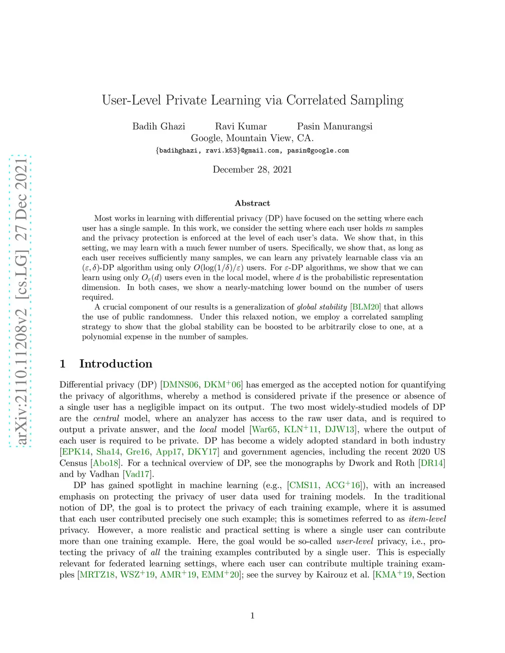 Most works in learning with differential privacy (DP) have focused on the setting where each user has a single sample. In this work, we consider the setting where each user holds samples and the privacy protection is enforced at the level of each user's data. We show that, in this setting, we may learn with a much fewer number of users. Specifically, we show that, as long as each user receives sufficiently many samples, we can learn any privately learnable class via an -DP algorithm using only users. For -DP algorithms, we show that we can learn using only users even in the local model, where is the probabilistic representation dimension. In both cases, we show a nearly-matching lower bound on the number of users required. A crucial component of our results is a generalization of global stability [Bun et al., FOCS 2020] that allows the use of public randomness. Under this relaxed notion, we employ a correlated sampling strategy to show that the global stability can be boosted to be arbitrarily close to one, at a polynomial expense in the number of samples.