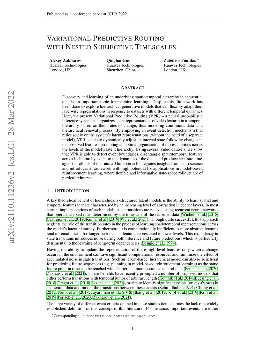Discovery and learning of an underlying spatiotemporal hierarchy in sequential data is an important topic for machine learning. Despite this, little work has been done to explore hierarchical generative models that can flexibly adapt their layerwise representations in response to datasets with different temporal dynamics. Here, we present Variational Predictive Routing (VPR) - a neural probabilistic inference system that organizes latent representations of video features in a temporal hierarchy, based on their rates of change, thus modeling continuous data as a hierarchical renewal process. By employing an event detection mechanism that relies solely on the system's latent representations (without the need of a separate model), VPR is able to dynamically adjust its internal state following changes in the observed features, promoting an optimal organisation of representations across the levels of the model's latent hierarchy. Using several video datasets, we show that VPR is able to detect event boundaries, disentangle spatiotemporal features across its hierarchy, adapt to the dynamics of the data, and produce accurate time-agnostic rollouts of the future. Our approach integrates insights from neuroscience and introduces a framework with high potential for applications in model-based reinforcement learning, where flexible and informative state-space rollouts are of particular interest.