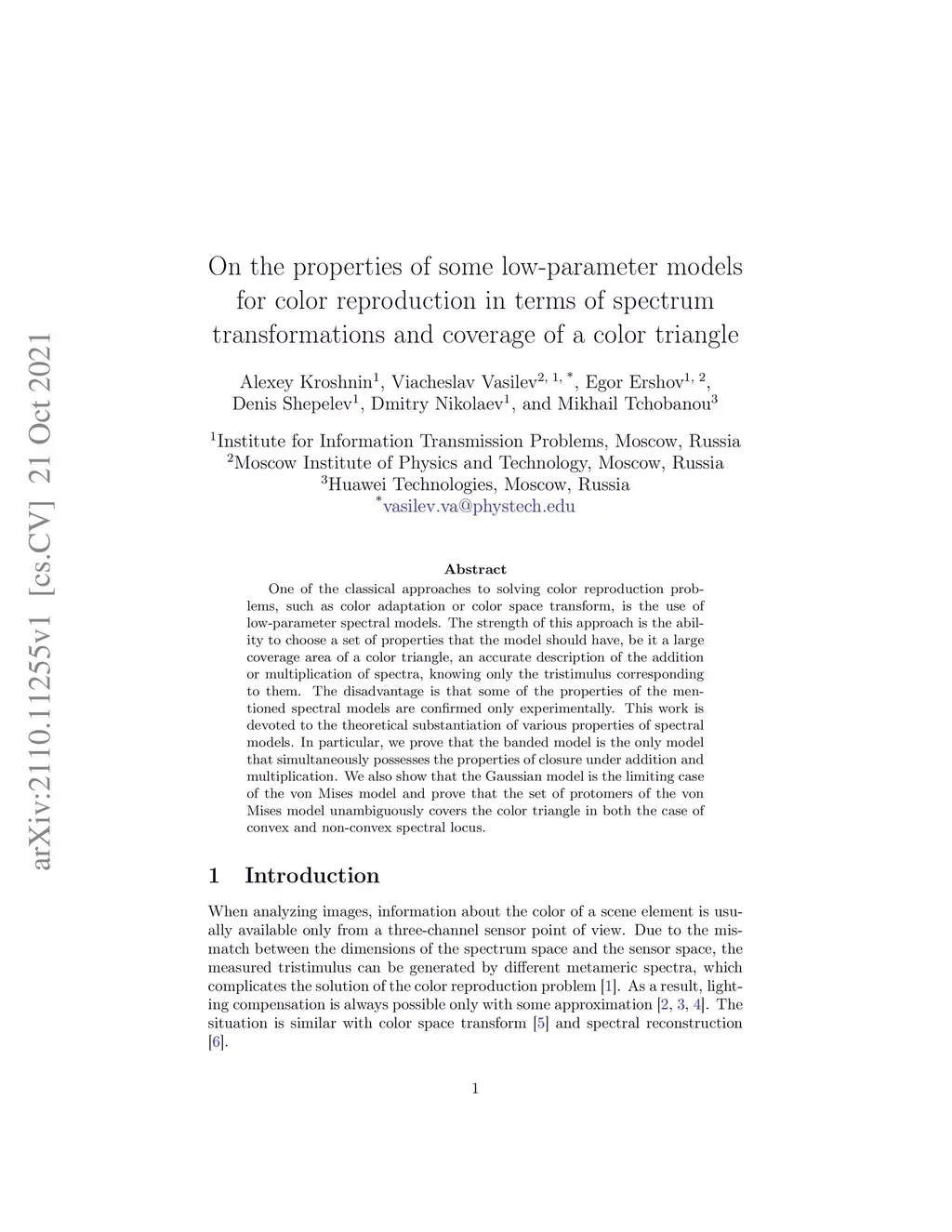One of the classical approaches to solving color reproduction problems, such as color adaptation or color space transform, is the use of low-parameter spectral models. The strength of this approach is the ability to choose a set of properties that the model should have, be it a large coverage area of a color triangle, an accurate description of the addition or multiplication of spectra, knowing only the tristimulus corresponding to them. The disadvantage is that some of the properties of the mentioned spectral models are confirmed only experimentally. This work is devoted to the theoretical substantiation of various properties of spectral models. In particular, we prove that the banded model is the only model that simultaneously possesses the properties of closure under addition and multiplication. We also show that the Gaussian model is the limiting case of the von Mises model and prove that the set of protomers of the von Mises model unambiguously covers the color triangle in both the case of convex and non-convex spectral locus.