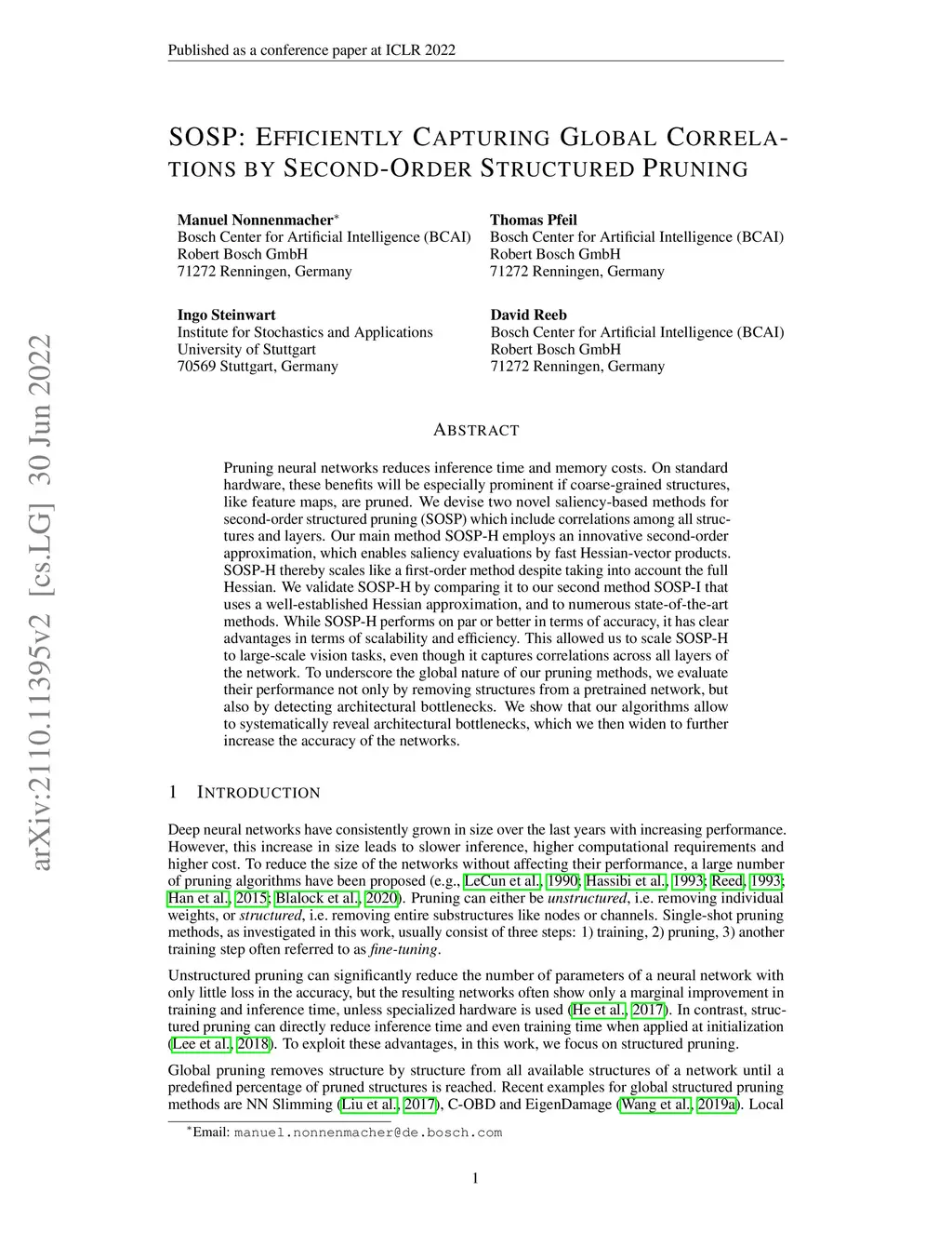 Pruning neural networks reduces inference time and memory costs. On standard hardware, these benefits will be especially prominent if coarse-grained structures, like feature maps, are pruned. We devise two novel saliency-based methods for second-order structured pruning (SOSP) which include correlations among all structures and layers. Our main method SOSP-H employs an innovative second-order approximation, which enables saliency evaluations by fast Hessian-vector products. SOSP-H thereby scales like a first-order method despite taking into account the full Hessian. We validate SOSP-H by comparing it to our second method SOSP-I that uses a well-established Hessian approximation, and to numerous state-of-the-art methods. While SOSP-H performs on par or better in terms of accuracy, it has clear advantages in terms of scalability and efficiency. This allowed us to scale SOSP-H to large-scale vision tasks, even though it captures correlations across all layers of the network. To underscore the global nature of our pruning methods, we evaluate their performance not only by removing structures from a pretrained network, but also by detecting architectural bottlenecks. We show that our algorithms allow to systematically reveal architectural bottlenecks, which we then remove to further increase the accuracy of the networks.