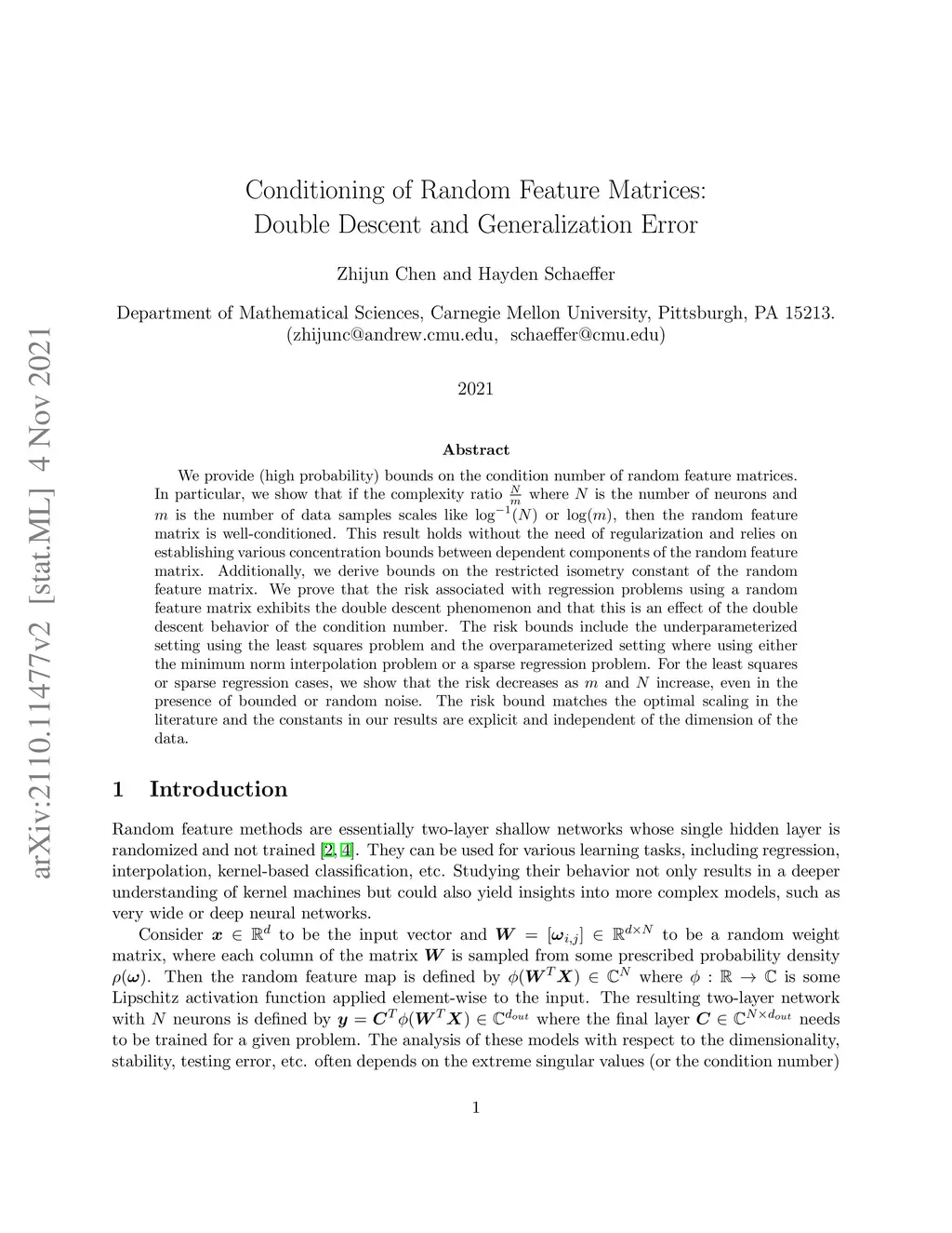 We provide (high probability) bounds on the condition number of random feature matrices. In particular, we show that if the complexity ratio where is the number of neurons and is the number of data samples scales like or , then the random feature matrix is well-conditioned. This result holds without the need of regularization and relies on establishing various concentration bounds between dependent components of the random feature matrix. Additionally, we derive bounds on the restricted isometry constant of the random feature matrix. We prove that the risk associated with regression problems using a random feature matrix exhibits the double descent phenomenon and that this is an effect of the double descent behavior of the condition number. The risk bounds include the underparameterized setting using the least squares problem and the overparameterized setting where using either the minimum norm interpolation problem or a sparse regression problem. For the least squares or sparse regression cases, we show that the risk decreases as and increase, even in the presence of bounded or random noise. The risk bound matches the optimal scaling in the literature and the constants in our results are explicit and independent of the dimension of the data.