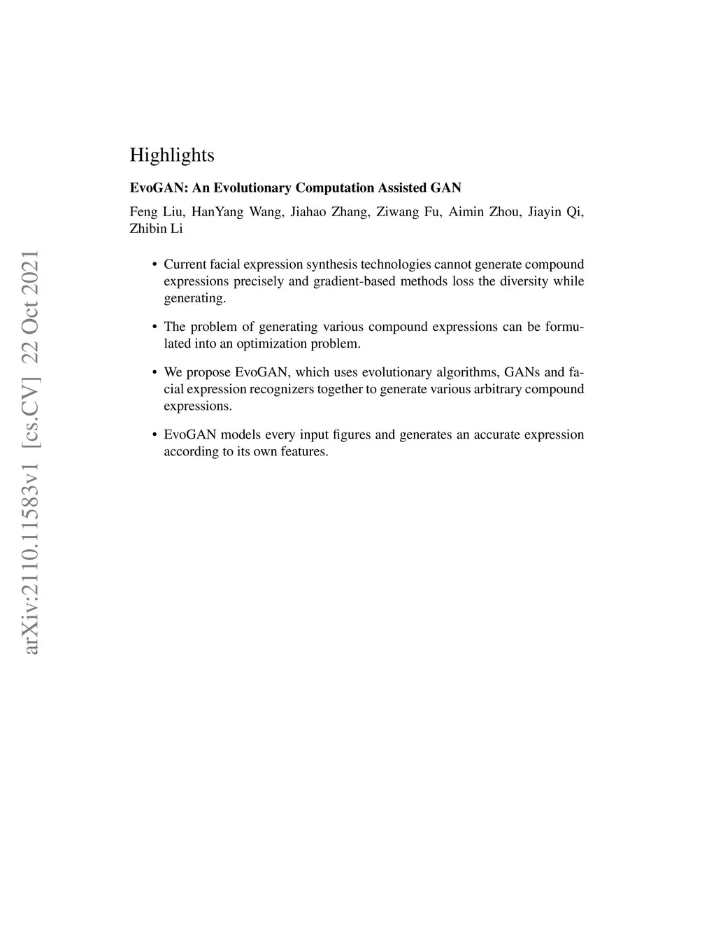 The image synthesis technique is relatively well established which can generate facial images that are indistinguishable even by human beings. However, all of these approaches uses gradients to condition the output, resulting in the outputting the same image with the same input. Also, they can only generate images with basic expression or mimic an expression instead of generating compound expression. In real life, however, human expressions are of great diversity and complexity. In this paper, we propose an evolutionary algorithm (EA) assisted GAN, named EvoGAN, to generate various compound expressions with any accurate target compound expression. EvoGAN uses an EA to search target results in the data distribution learned by GAN. Specifically, we use the Facial Action Coding System (FACS) as the encoding of an EA and use a pre-trained GAN to generate human facial images, and then use a pre-trained classifier to recognize the expression composition of the synthesized images as the fitness function to guide the search of the EA. Combined random searching algorithm, various images with the target expression can be easily sythesized. Quantitative and Qualitative results are presented on several compound expressions, and the experimental results demonstrate the feasibility and the potential of EvoGAN.