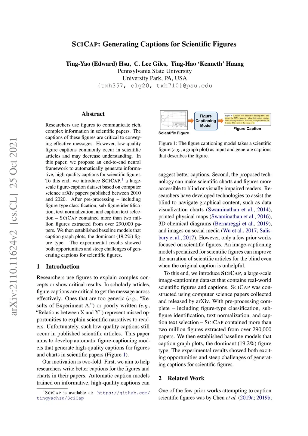 Researchers use figures to communicate rich, complex information in scientific papers. The captions of these figures are critical to conveying effective messages. However, low-quality figure captions commonly occur in scientific articles and may decrease understanding. In this paper, we propose an end-to-end neural framework to automatically generate informative, high-quality captions for scientific figures. To this end, we introduce SCICAP, a large-scale figure-caption dataset based on computer science arXiv papers published between 2010 and 2020. After pre-processing - including figure-type classification, sub-figure identification, text normalization, and caption text selection - SCICAP contained more than two million figures extracted from over 290,000 papers. We then established baseline models that caption graph plots, the dominant (19.2%) figure type. The experimental results showed both opportunities and steep challenges of generating captions for scientific figures.