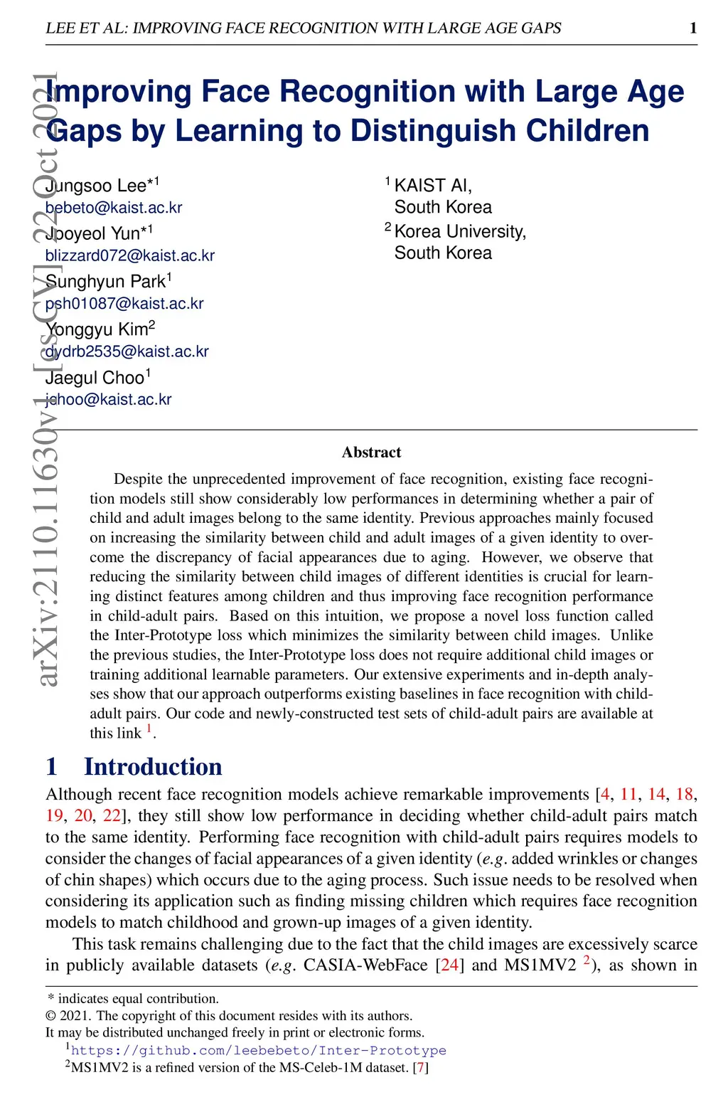 Despite the unprecedented improvement of face recognition, existing face recognition models still show considerably low performances in determining whether a pair of child and adult images belong to the same identity. Previous approaches mainly focused on increasing the similarity between child and adult images of a given identity to overcome the discrepancy of facial appearances due to aging. However, we observe that reducing the similarity between child images of different identities is crucial for learning distinct features among children and thus improving face recognition performance in child-adult pairs. Based on this intuition, we propose a novel loss function called the Inter-Prototype loss which minimizes the similarity between child images. Unlike the previous studies, the Inter-Prototype loss does not require additional child images or training additional learnable parameters. Our extensive experiments and in-depth analyses show that our approach outperforms existing baselines in face recognition with child-adult pairs. Our code and newly-constructed test sets of child-adult pairs are available at https://github.com/leebebeto/Inter-Prototype.