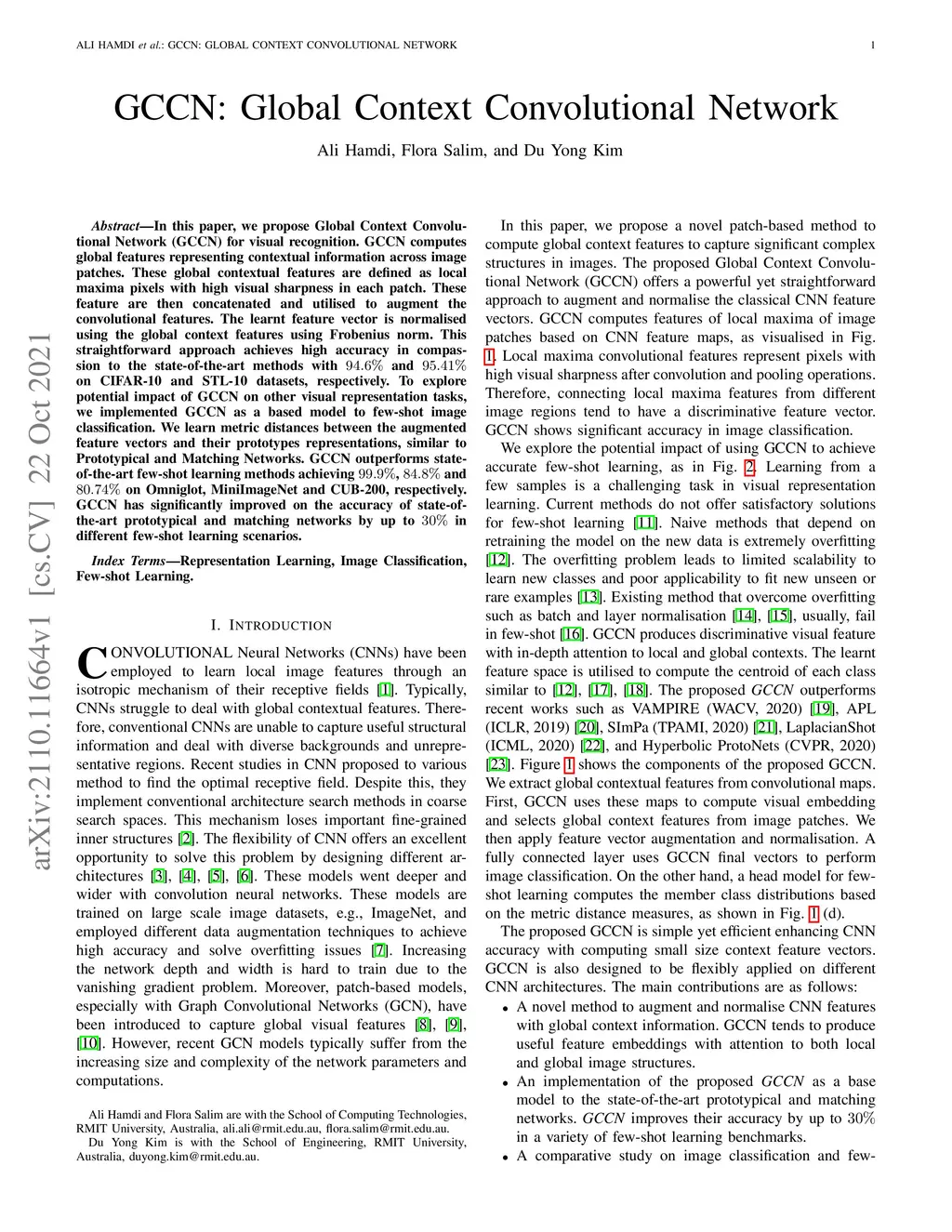 In this paper, we propose Global Context Convolutional Network (GCCN) for visual recognition. GCCN computes global features representing contextual information across image patches. These global contextual features are defined as local maxima pixels with high visual sharpness in each patch. These features are then concatenated and utilised to augment the convolutional features. The learnt feature vector is normalised using the global context features using Frobenius norm. This straightforward approach achieves high accuracy in compassion to the state-of-the-art methods with 94.6% and 95.41% on CIFAR-10 and STL-10 datasets, respectively. To explore potential impact of GCCN on other visual representation tasks, we implemented GCCN as a based model to few-shot image classification. We learn metric distances between the augmented feature vectors and their prototypes representations, similar to Prototypical and Matching Networks. GCCN outperforms state-of-the-art few-shot learning methods achieving 99.9%, 84.8% and 80.74% on Omniglot, MiniImageNet and CUB-200, respectively. GCCN has significantly improved on the accuracy of state-of-the-art prototypical and matching networks by up to 30% in different few-shot learning scenarios.