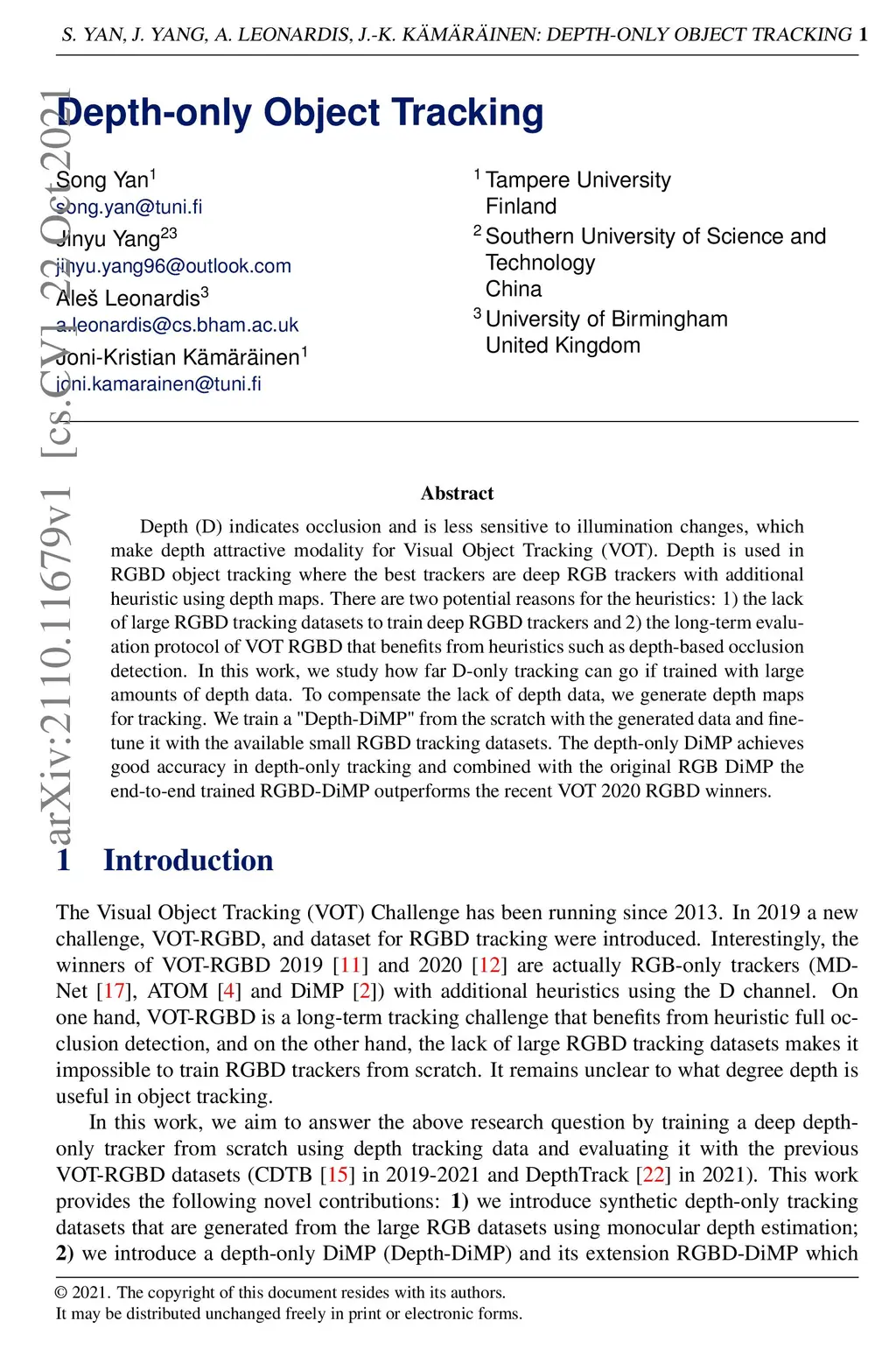 Depth (D) indicates occlusion and is less sensitive to illumination changes, which make depth attractive modality for Visual Object Tracking (VOT). Depth is used in RGBD object tracking where the best trackers are deep RGB trackers with additional heuristic using depth maps. There are two potential reasons for the heuristics: 1) the lack of large RGBD tracking datasets to train deep RGBD trackers and 2) the long-term evaluation protocol of VOT RGBD that benefits from heuristics such as depth-based occlusion detection. In this work, we study how far D-only tracking can go if trained with large amounts of depth data. To compensate the lack of depth data, we generate depth maps for tracking. We train a "Depth-DiMP" from the scratch with the generated data and fine-tune it with the available small RGBD tracking datasets. The depth-only DiMP achieves good accuracy in depth-only tracking and combined with the original RGB DiMP the end-to-end trained RGBD-DiMP outperforms the recent VOT 2020 RGBD winners.