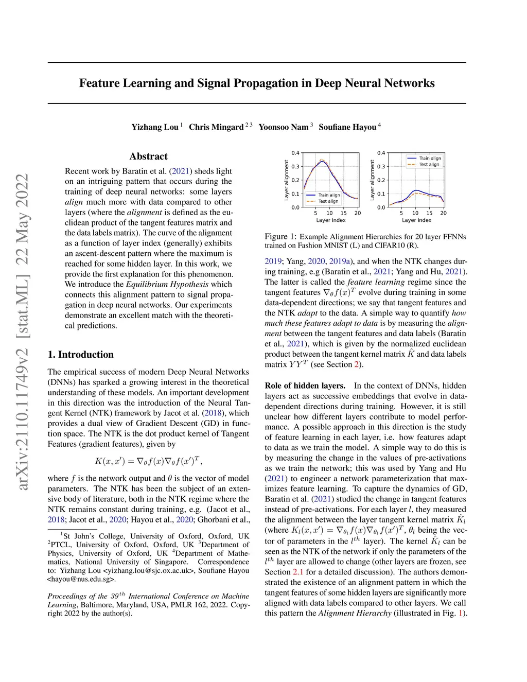 Recent work by Baratin et al. (2021) sheds light on an intriguing pattern that occurs during the training of deep neural networks: some layers align much more with data compared to other layers (where the alignment is defined as the euclidean product of the tangent features matrix and the data labels matrix). The curve of the alignment as a function of layer index (generally) exhibits an ascent-descent pattern where the maximum is reached for some hidden layer. In this work, we provide the first explanation for this phenomenon. We introduce the Equilibrium Hypothesis which connects this alignment pattern to signal propagation in deep neural networks. Our experiments demonstrate an excellent match with the theoretical predictions.