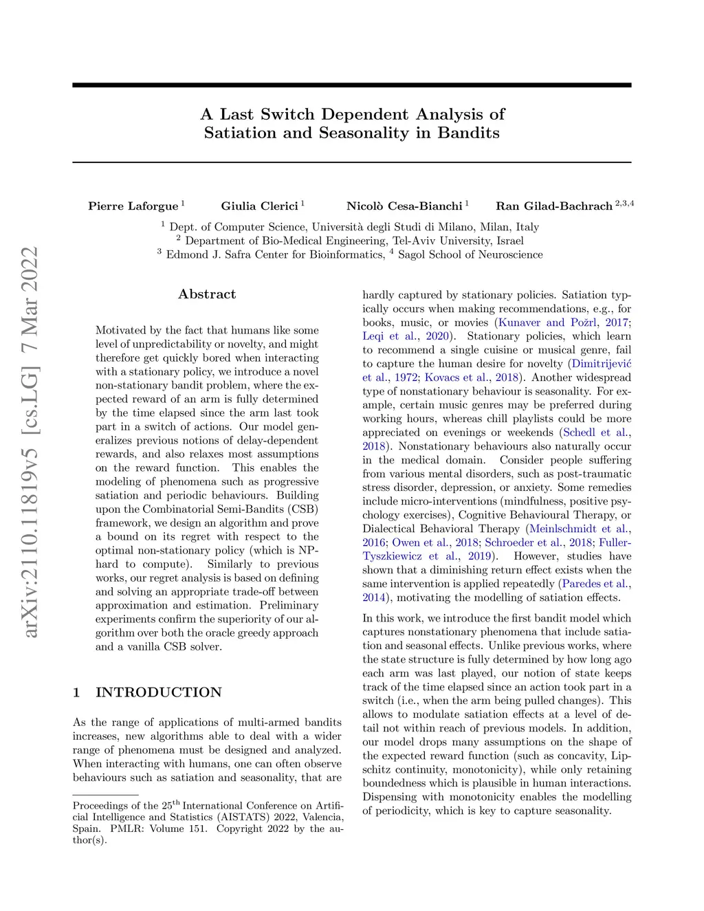Motivated by the fact that humans like some level of unpredictability or novelty, and might therefore get quickly bored when interacting with a stationary policy, we introduce a novel non-stationary bandit problem, where the expected reward of an arm is fully determined by the time elapsed since the arm last took part in a switch of actions. Our model generalizes previous notions of delay-dependent rewards, and also relaxes most assumptions on the reward function. This enables the modeling of phenomena such as progressive satiation and periodic behaviours. Building upon the Combinatorial Semi-Bandits (CSB) framework, we design an algorithm and prove a bound on its regret with respect to the optimal non-stationary policy (which is NP-hard to compute). Similarly to previous works, our regret analysis is based on defining and solving an appropriate trade-off between approximation and estimation. Preliminary experiments confirm the superiority of our algorithm over both the oracle greedy approach and a vanilla CSB solver.