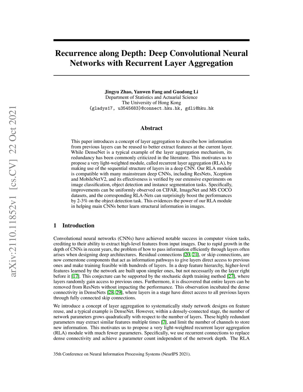 This paper introduces a concept of layer aggregation to describe how information from previous layers can be reused to better extract features at the current layer. While DenseNet is a typical example of the layer aggregation mechanism, its redundancy has been commonly criticized in the literature. This motivates us to propose a very light-weighted module, called recurrent layer aggregation (RLA), by making use of the sequential structure of layers in a deep CNN. Our RLA module is compatible with many mainstream deep CNNs, including ResNets, Xception and MobileNetV2, and its effectiveness is verified by our extensive experiments on image classification, object detection and instance segmentation tasks. Specifically, improvements can be uniformly observed on CIFAR, ImageNet and MS COCO datasets, and the corresponding RLA-Nets can surprisingly boost the performances by 2-3% on the object detection task. This evidences the power of our RLA module in helping main CNNs better learn structural information in images.