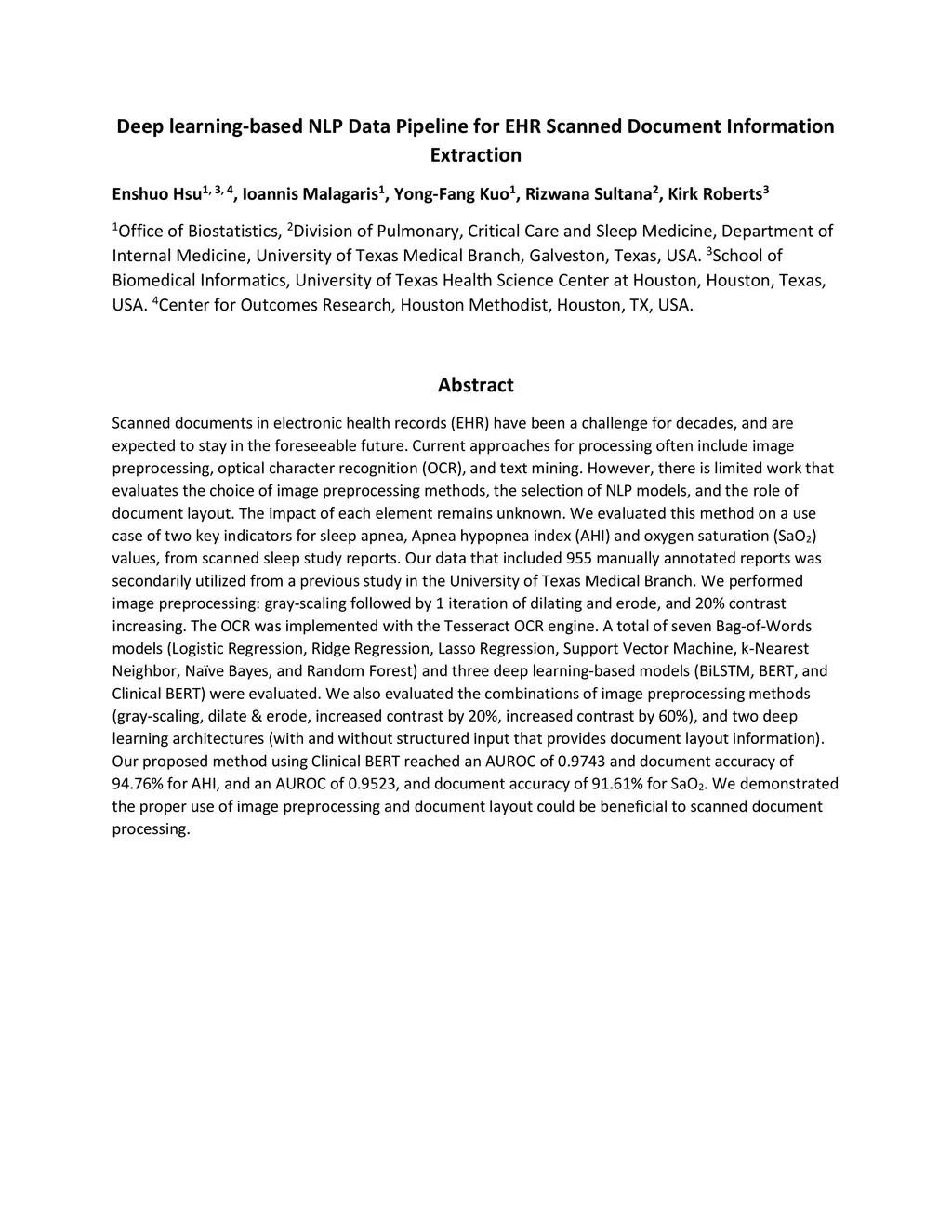 Scanned documents in electronic health records (EHR) have been a challenge for decades, and are expected to stay in the foreseeable future. Current approaches for processing often include image preprocessing, optical character recognition (OCR), and text mining. However, there is limited work that evaluates the choice of image preprocessing methods, the selection of NLP models, and the role of document layout. The impact of each element remains unknown. We evaluated this method on a use case of two key indicators for sleep apnea, Apnea hypopnea index (AHI) and oxygen saturation (SaO2) values, from scanned sleep study reports. Our data that included 955 manually annotated reports was secondarily utilized from a previous study in the University of Texas Medical Branch. We performed image preprocessing: gray-scaling followed by 1 iteration of dilating and erode, and 20% contrast increasing. The OCR was implemented with the Tesseract OCR engine. A total of seven Bag-of-Words models (Logistic Regression, Ridge Regression, Lasso Regression, Support Vector Machine, k-Nearest Neighbor, Na\"ive Bayes, and Random Forest) and three deep learning-based models (BiLSTM, BERT, and Clinical BERT) were evaluated. We also evaluated the combinations of image preprocessing methods (gray-scaling, dilate & erode, increased contrast by 20%, increased contrast by 60%), and two deep learning architectures (with and without structured input that provides document layout information). Our proposed method using Clinical BERT reached an AUROC of 0.9743 and document accuracy of 94.76% for AHI, and an AUROC of 0.9523, and document accuracy of 91.61% for SaO2. We demonstrated the proper use of image preprocessing and document layout could be beneficial to scanned document processing.