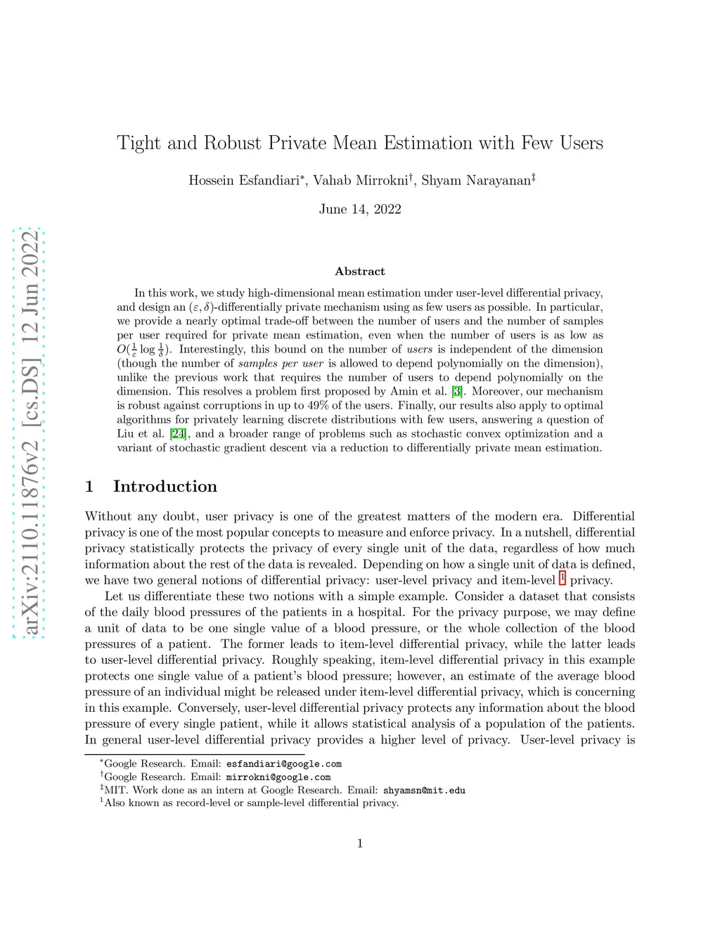 In this work, we study high-dimensional mean estimation under user-level differential privacy, and attempt to design an -differentially private mechanism using as few users as possible. In particular, we provide a nearly optimal trade-off between the number of users and the number of samples per user required for private mean estimation, even when the number of users is as low as . Interestingly our bound on the number of users is independent of the dimension, unlike the previous work that depends polynomially on the dimension, solving a problem left open by Amin et al.~(ICML'2019). Our mechanism enjoys robustness up to the point that even if the information of of the users are corrupted, our final estimation is still approximately accurate. Finally, our results also apply to a broader range of problems such as learning discrete distributions, stochastic convex optimization, empirical risk minimization, and a variant of stochastic gradient descent via a reduction to differentially private mean estimation.