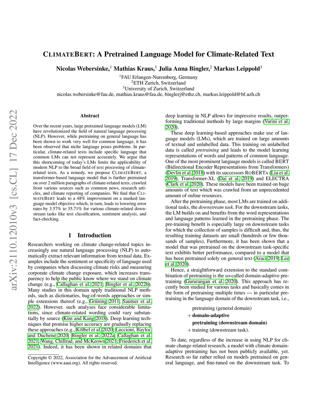 ClimateBert: A Pretrained Language Model for Climate-Related Text