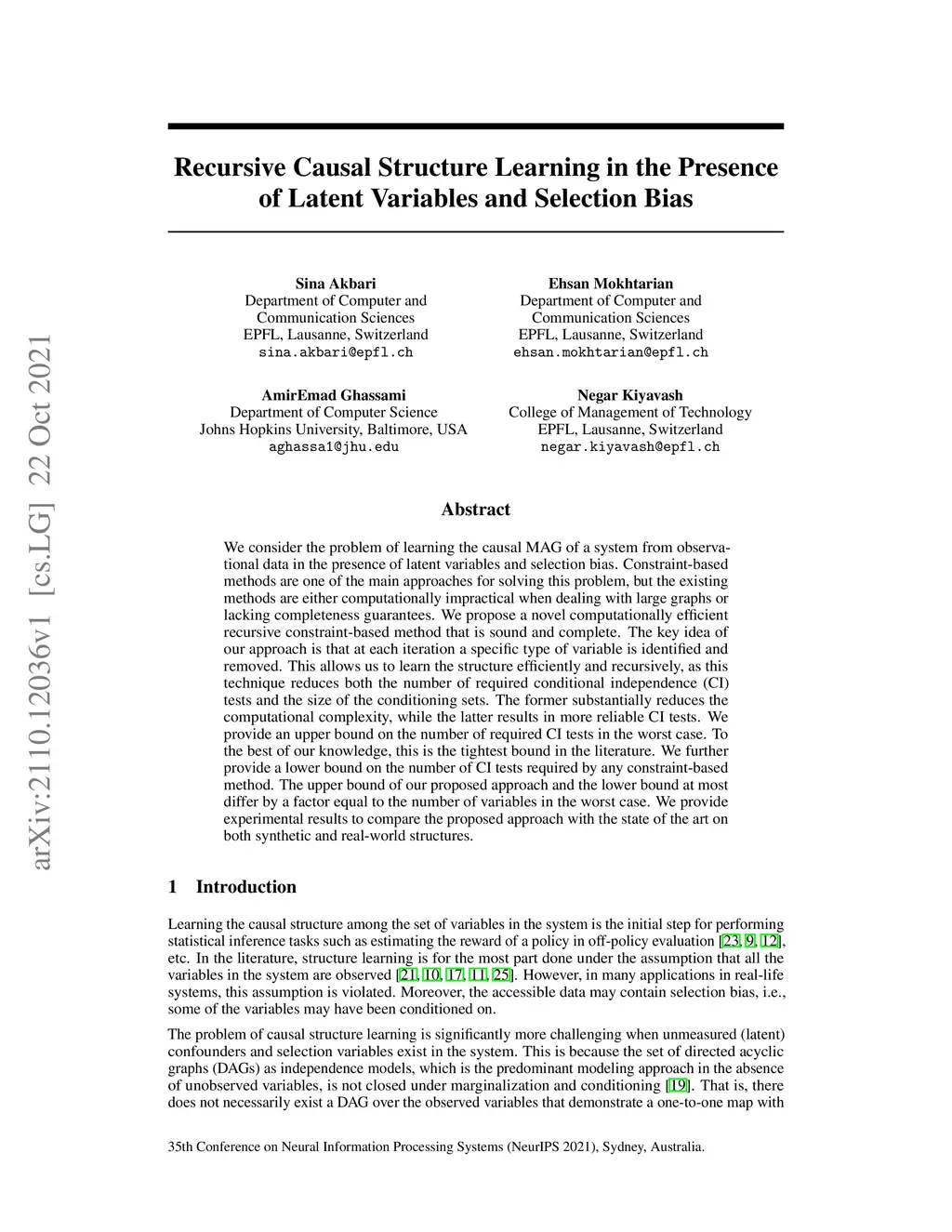 We consider the problem of learning the causal MAG of a system from observational data in the presence of latent variables and selection bias. Constraint-based methods are one of the main approaches for solving this problem, but the existing methods are either computationally impractical when dealing with large graphs or lacking completeness guarantees. We propose a novel computationally efficient recursive constraint-based method that is sound and complete. The key idea of our approach is that at each iteration a specific type of variable is identified and removed. This allows us to learn the structure efficiently and recursively, as this technique reduces both the number of required conditional independence (CI) tests and the size of the conditioning sets. The former substantially reduces the computational complexity, while the latter results in more reliable CI tests. We provide an upper bound on the number of required CI tests in the worst case. To the best of our knowledge, this is the tightest bound in the literature. We further provide a lower bound on the number of CI tests required by any constraint-based method. The upper bound of our proposed approach and the lower bound at most differ by a factor equal to the number of variables in the worst case. We provide experimental results to compare the proposed approach with the state of the art on both synthetic and real-world structures.