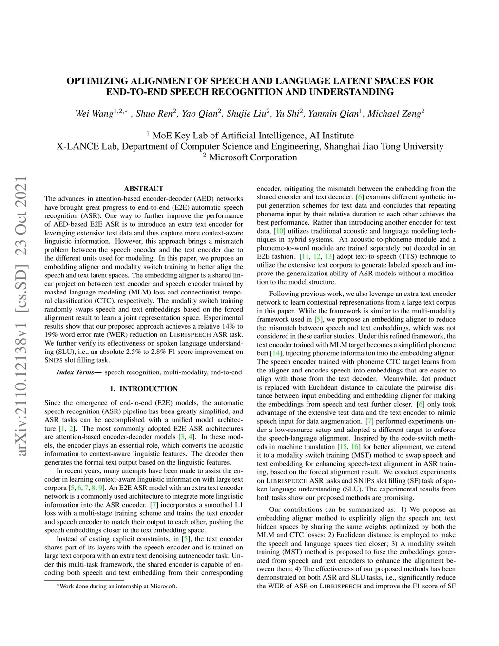 The advances in attention-based encoder-decoder (AED) networks have brought great progress to end-to-end (E2E) automatic speech recognition (ASR). One way to further improve the performance of AED-based E2E ASR is to introduce an extra text encoder for leveraging extensive text data and thus capture more context-aware linguistic information. However, this approach brings a mismatch problem between the speech encoder and the text encoder due to the different units used for modeling. In this paper, we propose an embedding aligner and modality switch training to better align the speech and text latent spaces. The embedding aligner is a shared linear projection between text encoder and speech encoder trained by masked language modeling (MLM) loss and connectionist temporal classification (CTC), respectively. The modality switch training randomly swaps speech and text embeddings based on the forced alignment result to learn a joint representation space. Experimental results show that our proposed approach achieves a relative 14% to 19% word error rate (WER) reduction on Librispeech ASR task. We further verify its effectiveness on spoken language understanding (SLU), i.e., an absolute 2.5% to 2.8% F1 score improvement on SNIPS slot filling task.