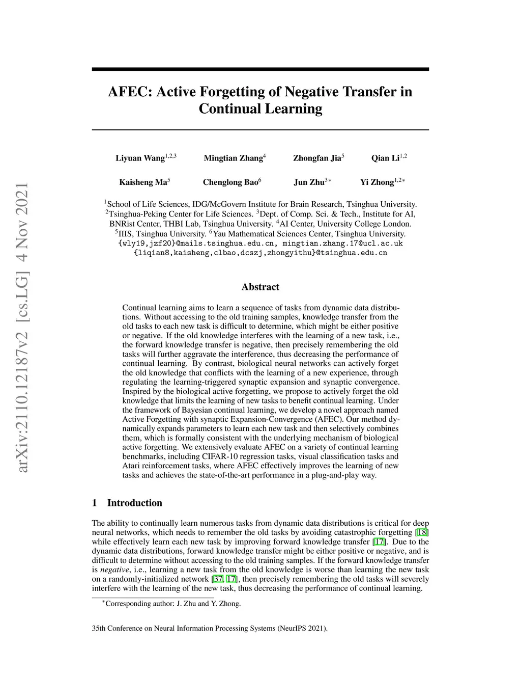 AFEC: Active Forgetting of Negative Transfer in Continual Learning