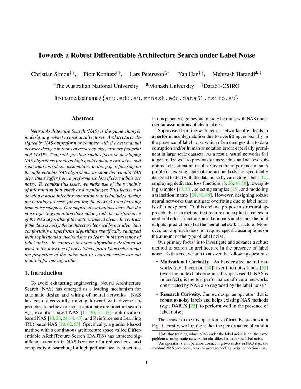 Neural Architecture Search (NAS) is the game changer in designing robust neural architectures. Architectures designed by NAS outperform or compete with the best manual network designs in terms of accuracy, size, memory footprint and FLOPs. That said, previous studies focus on developing NAS algorithms for clean high quality data, a restrictive and somewhat unrealistic assumption. In this paper, focusing on the differentiable NAS algorithms, we show that vanilla NAS algorithms suffer from a performance loss if class labels are noisy. To combat this issue, we make use of the principle of information bottleneck as a regularizer. This leads us to develop a noise injecting operation that is included during the learning process, preventing the network from learning from noisy samples. Our empirical evaluations show that the noise injecting operation does not degrade the performance of the NAS algorithm if the data is indeed clean. In contrast, if the data is noisy, the architecture learned by our algorithm comfortably outperforms algorithms specifically equipped with sophisticated mechanisms to learn in the presence of label noise. In contrast to many algorithms designed to work in the presence of noisy labels, prior knowledge about the properties of the noise and its characteristics are not required for our algorithm.